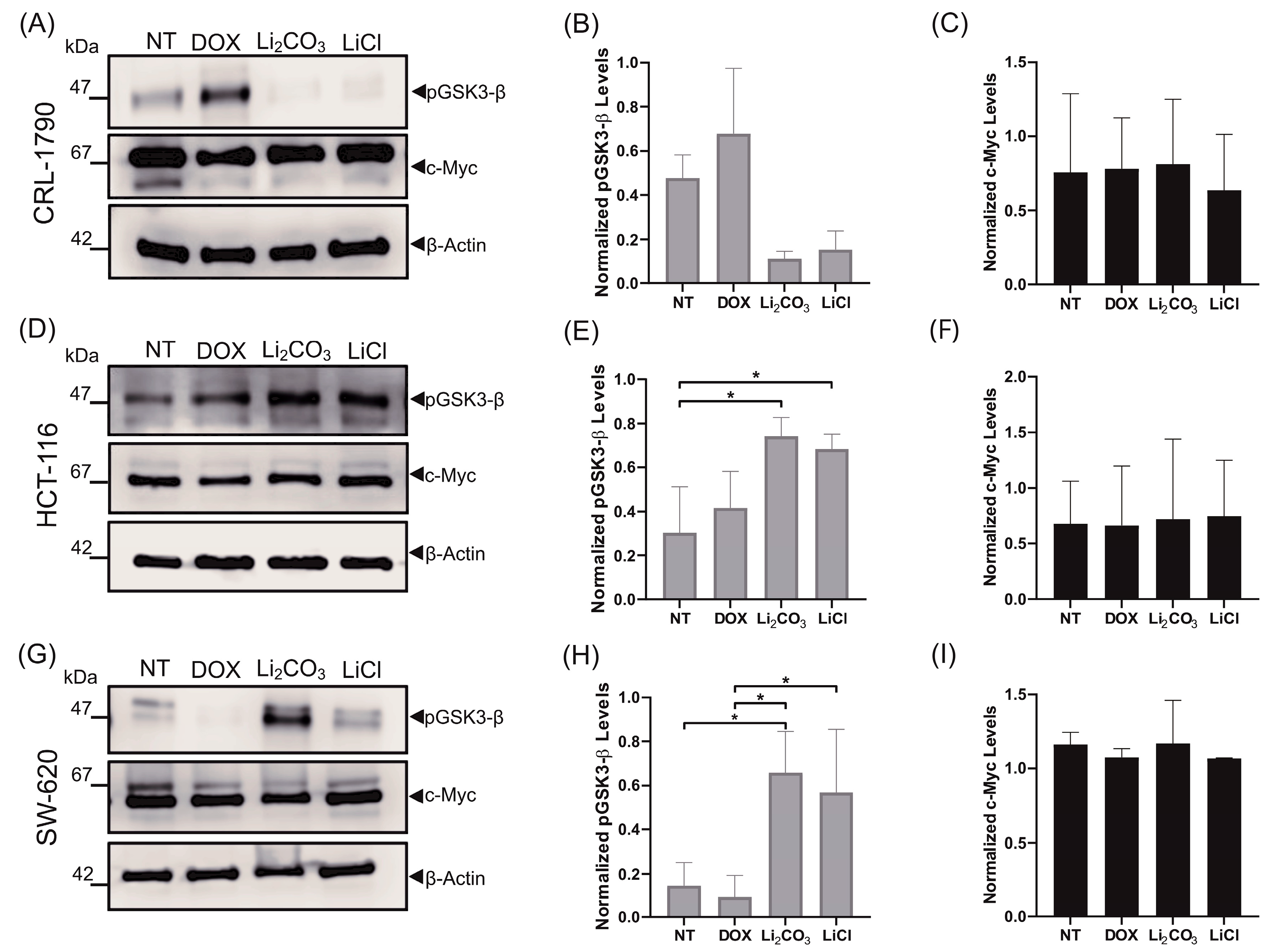 Figure 7. Effect of lithium salts on the expression of proliferation-related biomarker proteins after 24 h of treatment. Western Blot analysis was performed to assess the expression levels of the inactive (Ser9-phosphorylated) form of GSK-3β and c-Myc protein in CRL-1790 (Panels (AC)), HCT-116 (Panels (DF)), and SW620 (Panels (GI)) cells treated for 24 h with lithium chloride (LiCl) or lithium carbonate (Li2CO3), compared to untreated controls (NT). A decrease in phosphorylated GSK-3β was observed in CRL-1790 cells, whereas its expression increased in HCT-116 and SW620 cells upon treatment with both lithium salts. c-Myc protein expression was consistently detected across all cell lines and treatment conditions. β-actin was used as a loading control. Data represent the mean ± S.D. of three independent experiments. * p < 0.02, statistically significant by one-way ANOVA followed by Tukey’s multiple comparisons test.