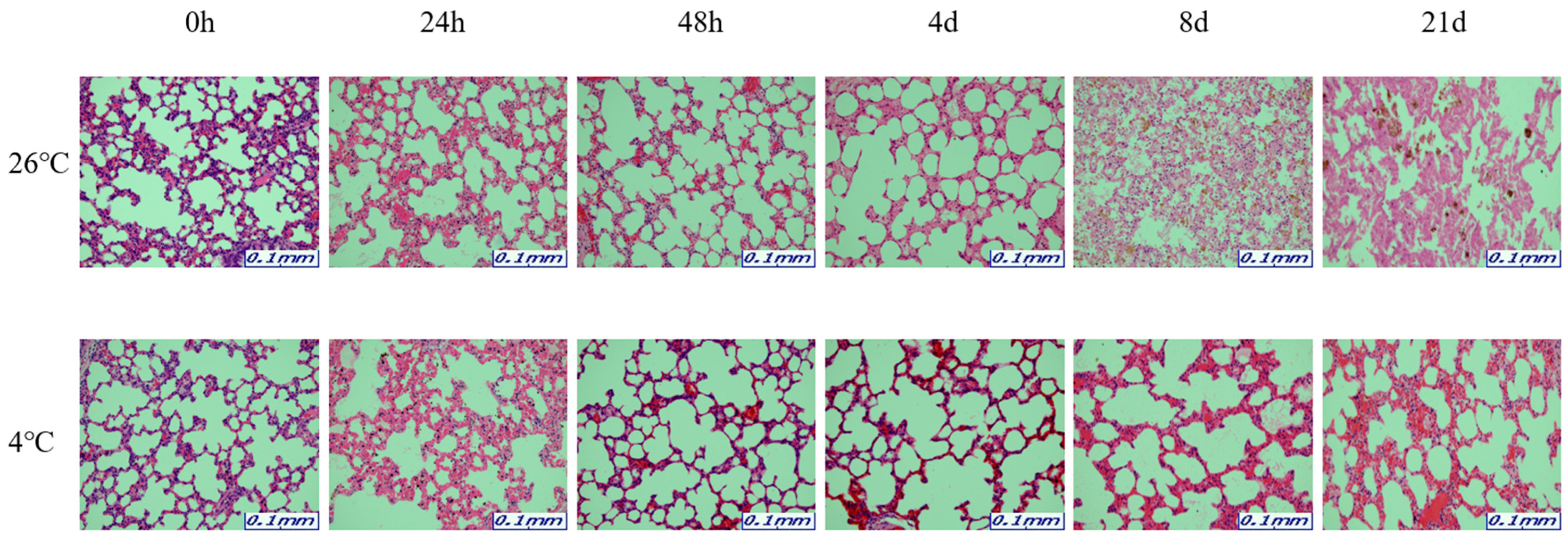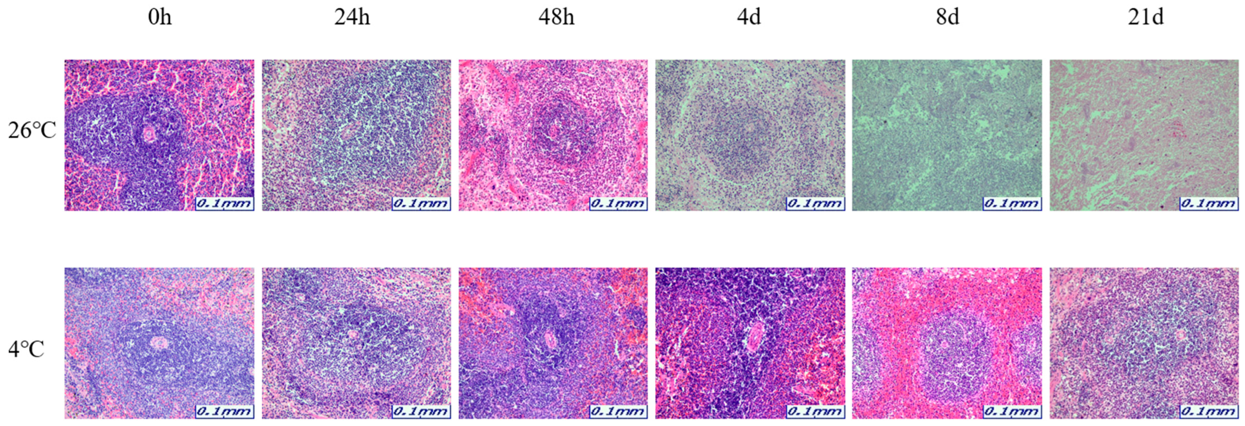 Figure 7 shows there was no significant change in the four collected tissue samples at 26 °C and 4 °C.