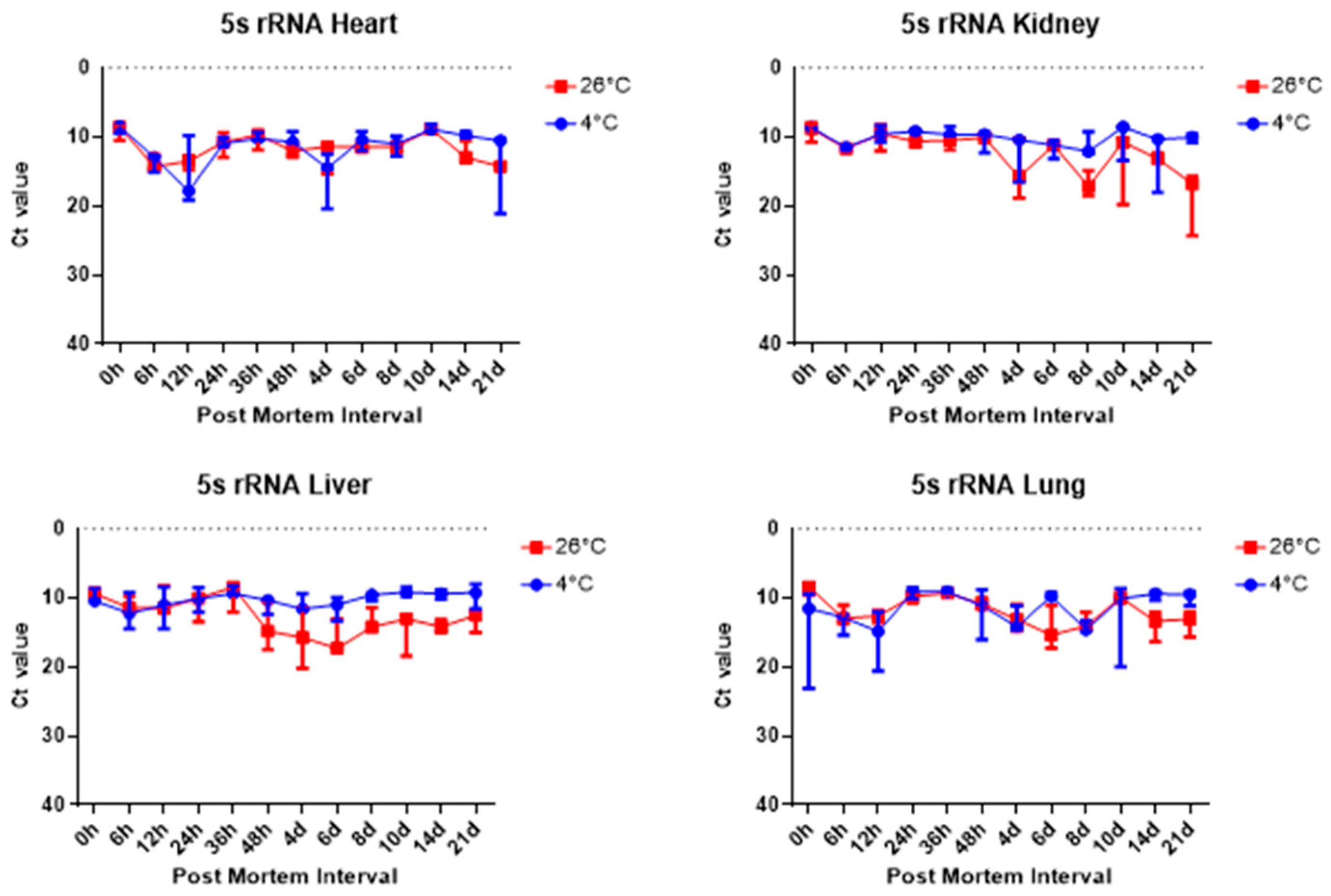The results revealed that most of the four organs containing heart, kidney, liver, and lung showed no nucleus or a lot of collapse after 8 days at 26 °C, but at 4 °C, the nucleus remained in shape until 21 days. Based on these histological results, total RNA was extracted for a comparison with the molecular results, including the Ct and delta Ct values. 5S rRNA is a structural RNA component with low Ct values, potentially resisting degradation by intracellular exonucleases. Ct values of 5S rRNA showed differences between 26 °C and 4 °C after 48 h in the kidney and the liver. Unexpectedly, Ct values for 5S rRNA decreased in the liver at 26 °C after 48 h, suggesting apparent RNA increase. This may reflect selective preservation or technical artifacts rather than genuine stabilization. Further experiments are needed to clarify whether this is due to reduced RT-qPCR inhibition or differences in RNA extraction efficiency over time. The genes selected in this study—5S rRNA, B2m, Gapdh, and Sort1—were chosen because they represent different molecular characteristics that may influence their post-mortem stability. 5S rRNA is a structural RNA component, relatively resistant to degradation, whereas B2m and Gapdh are commonly used housekeeping genes with stable expression under various physiological conditions. Sort1, a membrane-associated gene, was included to explore the behavior of a less conventional reference gene under post-mortem conditions. Differences in RNA degradation among these markers may reflect variations in transcript structure, localization, and protection by ribonucleoprotein complexes. 5S rRNA was chosen as a reference gene for its structural stability; however, as it is transcribed by RNA polymerase III, it may not be ideal for normalizing mRNA targets transcribed by RNA polymerase II. This difference may limit its suitability as a normalization reference for mRNA quantification. Moreover, the assumption that 5S rRNA remains constant across different PMIs and temperature conditions was not experimentally verified in this study. Therefore, future studies should experimentally validate the stability of 5S rRNA using commonly employed algorithms such as geNorm, NormFinder, or BestKeeper. Alternatively, incorporating multiple reference genes with proven stability under post-mortem conditions would strengthen normalization accuracy. This will help to confirm whether 5S rRNA is appropriate for PMI-related analyses or if mRNA-derived housekeeping genes provide a more reliable reference framework.
