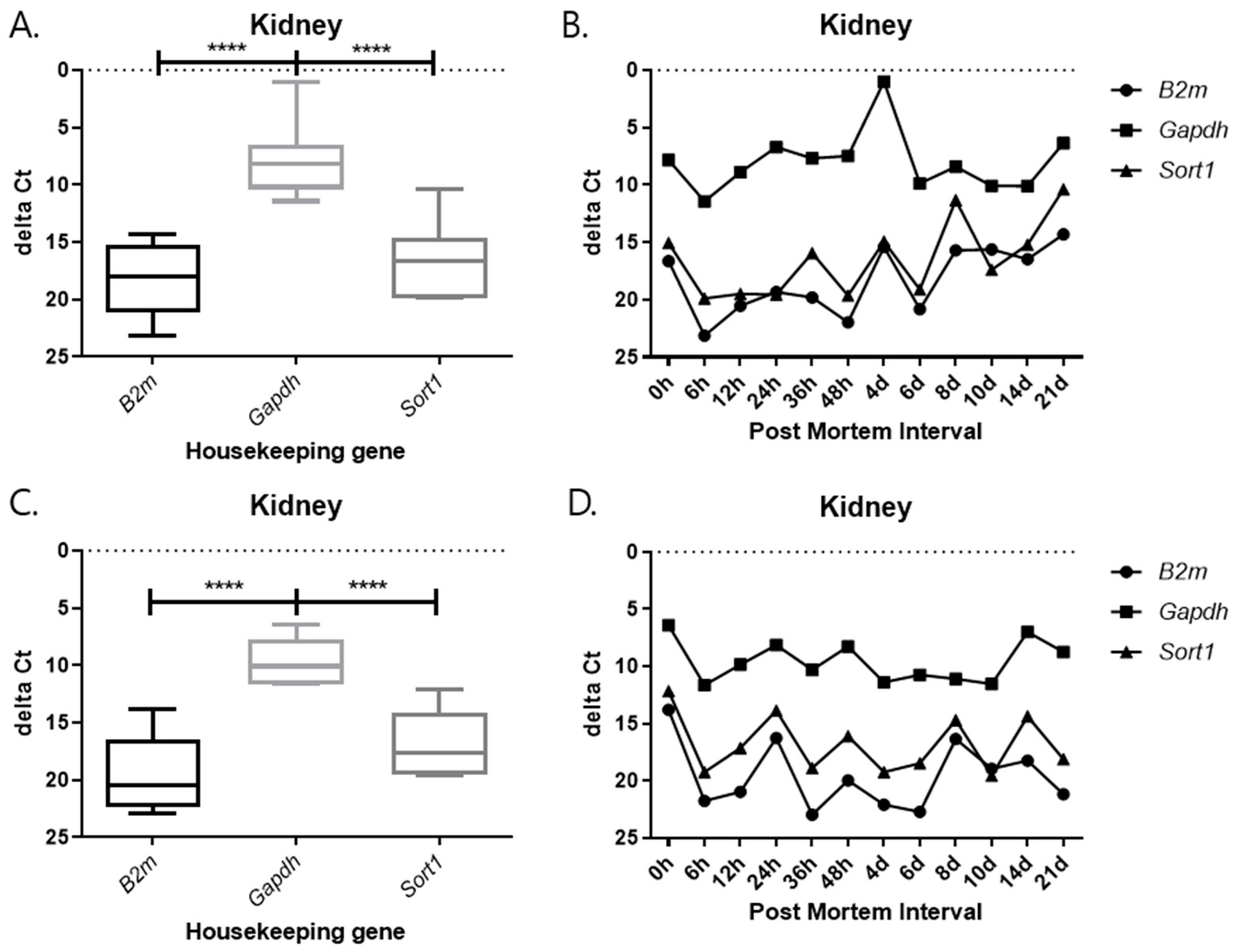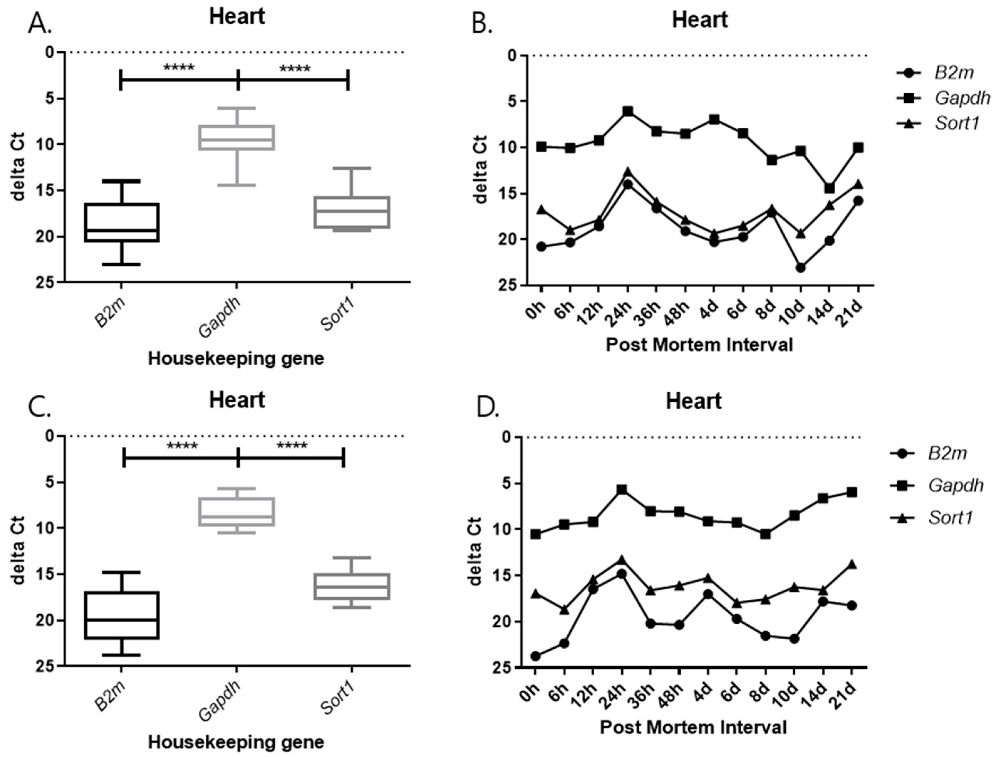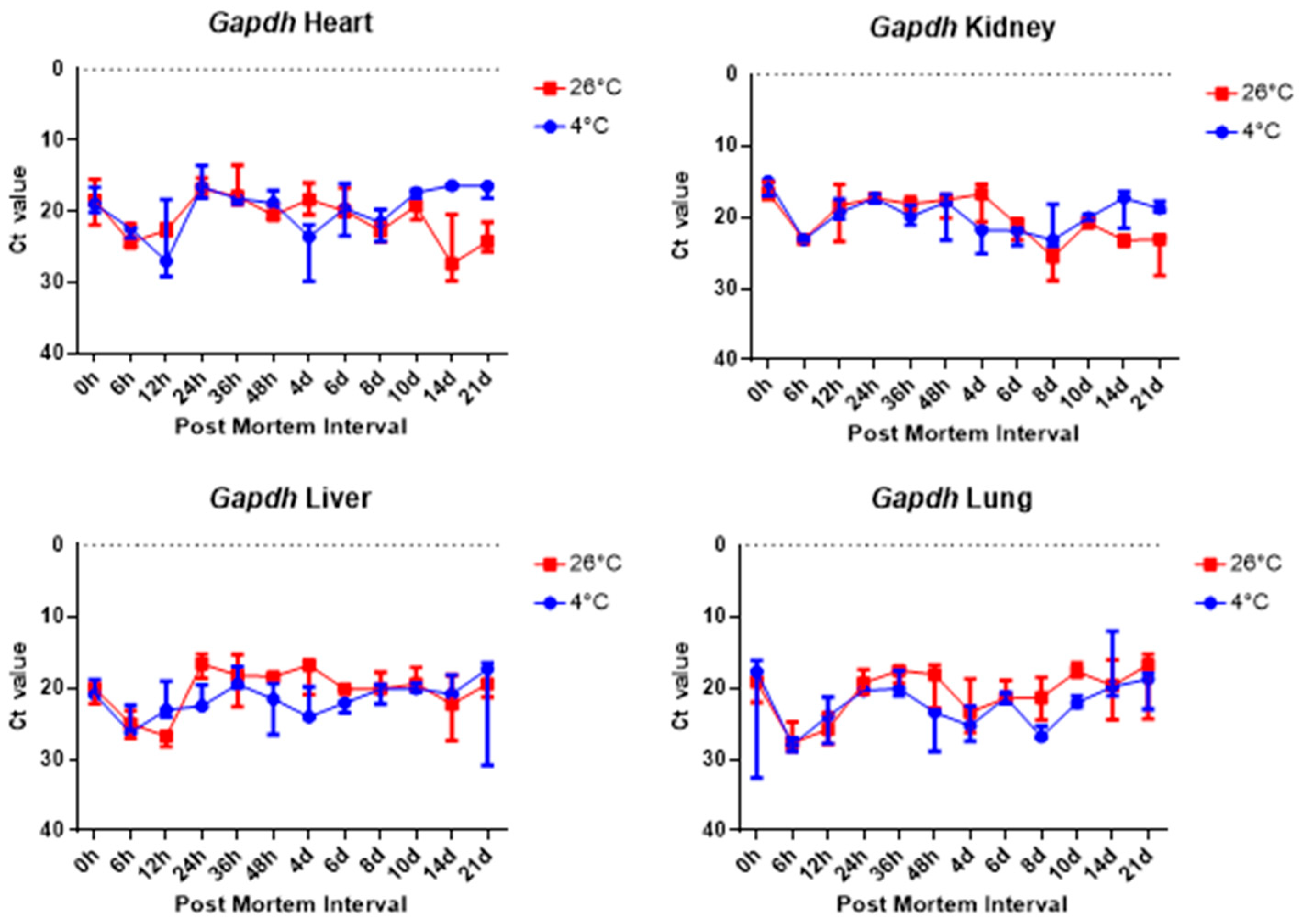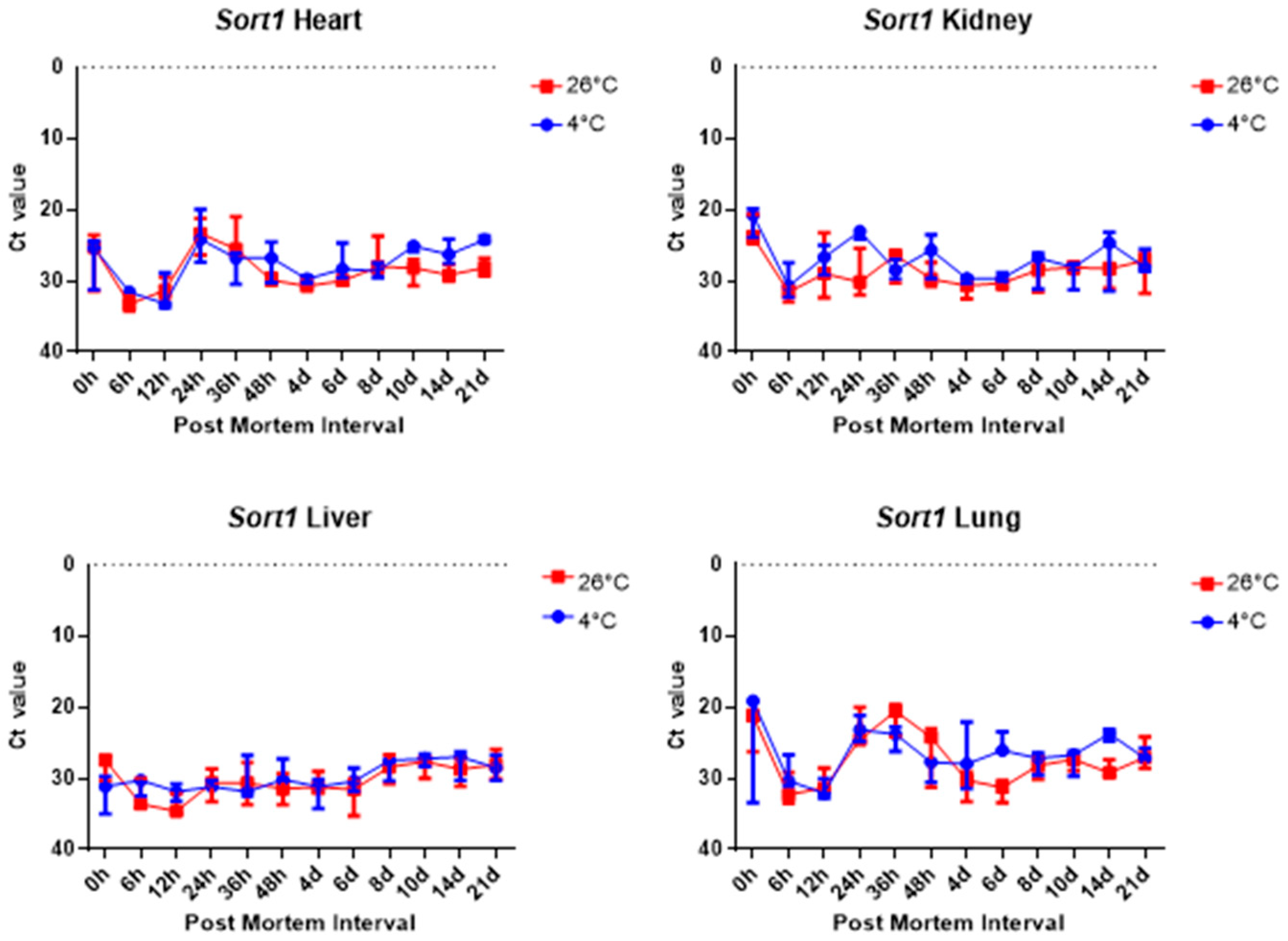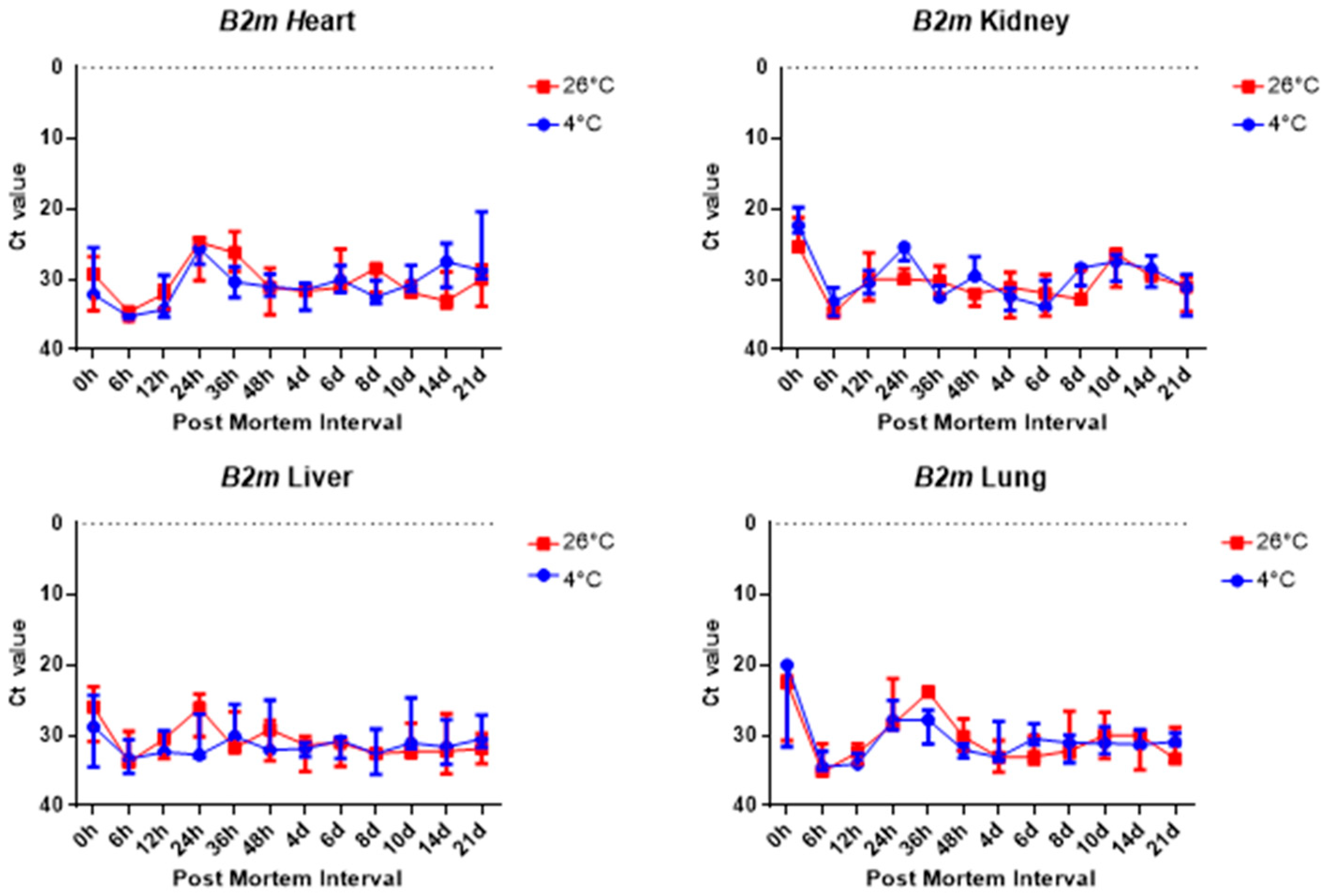 Delta Ct values were calculated by subtracting the reference gene from the target gene. In the 26 °C heart, Gapdh delta Ct values showed a gradual decrease according to PMI. In the 4 °C heart, there was a decrease in delta Ct values after 8 days. Overall, under 4 °C conditions, B2m, Gapdh, and Sort1 remained relatively constant without significant changes. In the 26 °C lung, Gapdh delta Ct values decreased as PMI increased, while in the 4 °C lung, stable values were observed after 12 h.