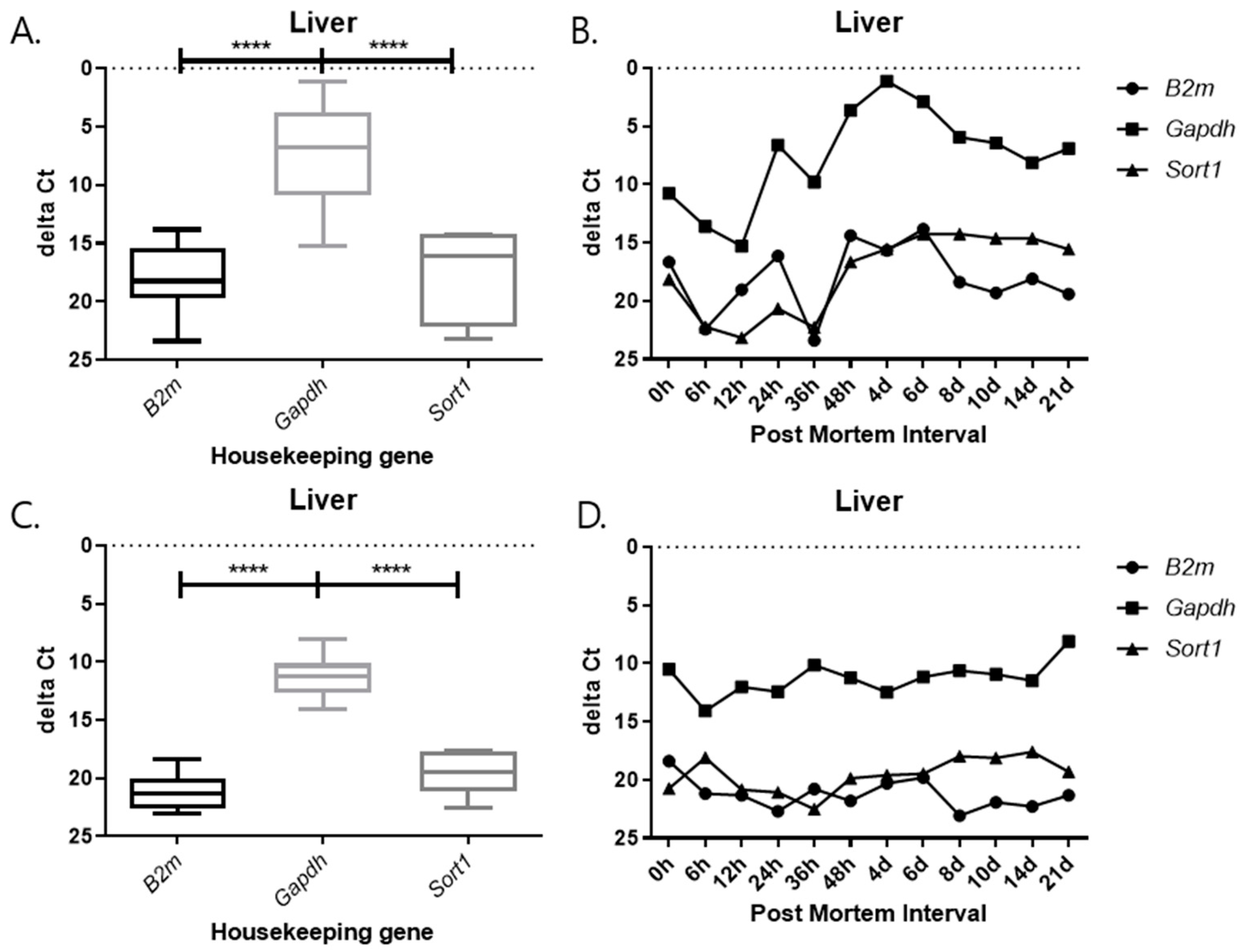 Statistical analysis was performed using GraphPad Prism v5.00 (GraphPad Software, San Diego, CA, USA). One-way ANOVA followed by Tukey’s post hoc test was used to evaluate significant differences in Ct and delta Ct values among different PMIs and tissues. A p-value < 0.05 was considered statistically significant. Data are presented as mean ± standard deviation (SD) and were calculated for each group. Significant differences among tissues, temperatures, PMI, and housekeeping genes were analyzed based on Ct values obtained from RT-qPCR. Delta Ct values were calculated by normalizing B2m, Gapdh, and Sort1 expression to 5S rRNA. Group comparisons were conducted using column-based replication and sub-column analysis across PMI time points.