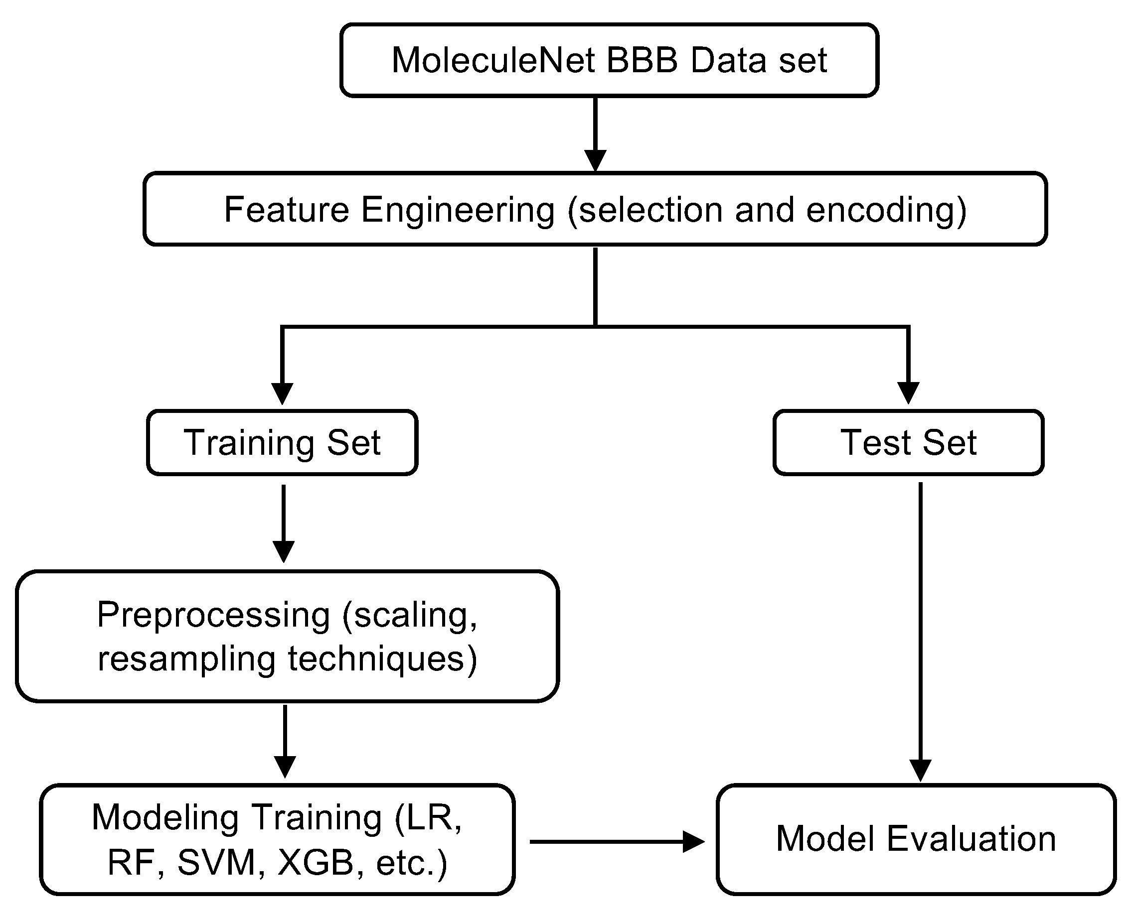 - Yang, Q.; Fan, L.; Hao, E.; Hou, X.; Deng, J.; Xia, Z.; Du, Z. Machine Learning Exploration of the Relationship Between Drugs and the Blood–Brain Barrier: Guiding Molecular Modification. Pharm. Res. 2024, 41, 863–875. [Google Scholar] [CrossRef]