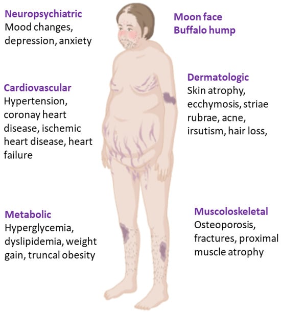 Cushing syndrome is a severe disorder caused by chronic GC excess, most often iatrogenic, or from ACTH-dependent/independent endogenous overproduction. Inappropriate cortisol secretion leads to severe multisystem morbidity for its cardiometabolic complications and increased mortality, often due to pulmonary embolism, infection, myocardial infarction, and cerebrovascular accidents [80,81]. Furthermore, even after remission, the risk of mortality is higher compared with the general population and patients can experience long-term side effects of the previous chronic and prolonged exposure to inappropriate endogenous GC levels [82], probably mediated by hypercortisolism-induced long-lasting epigenetic changes [83]. The main clinical features associated with CS have been reported in Figure 2.