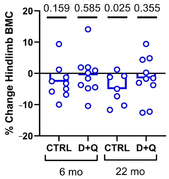 Previous work has shown the significant efficacy of senolytic drug treatment (Dasatinib + Quercetin, hereafter “D + Q”) on the clearance of senescent osteocytes in vivo [2]. To repeat and validate the effectiveness of senolytic therapy for our experimental model, we treated 6-month and 22-month-old WT mice with weekly senolytic (5 mg/kg Dasatinib; 50 mg/kg Quercetin) or vehicle treatment (10% PEG-400) for a total of four weeks, administered via oral gavage. To establish a baseline and end point, we collected DXA scans prior to the first treatment and several days before sacrifice (see Figure 1). The 22 mo. mice given vehicle gavage exhibited a significant reduction (p = 0.02) in hind limb bone mineral content (BMC) over the 7-week experimental period. However, the 22 mo. mice given D + Q treatment did not lose bone. No significant changes were detected in the 6 mo. mice, in terms of bone loss, either with or without D + Q treatment (Figure 1). Furthermore, in a separate set of 22 mo. old mice, we assayed the bone tissue for changes in senescence markers after 4 weeks of D + Q treatment. Long bone expression of p15, p16, p21, and p53 were all reduced by D + Q but significance was not reached (Supplementary Figure S1). We also prepared frozen femur sections from these mice for β-Gal staining, but no qualitative difference was detected in among treatment groups. Osteoclast prevalence was also unaffected by D + Q treatment (Supplementary Figure S2). These data, indicating that D + Q protects the aged skeleton from bone loss and (non-significantly) reduces some senescence markers, are consistent with our previous results [40] and suggest that D + Q works in 22 mo. mice.