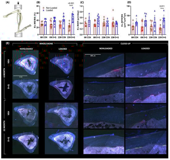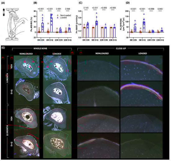 (A) Additional loading experiments were conducted utilizing a tibia axial loading model. The tibia axial loading model is a more appropriate model for the aged mice as it is used to evaluate the endocortical surface of the tibia, which is much more active in an aged skeleton and can better represent loading effects consistent with aging. Bone formation rates were measured using fluorochrome labels injected during the loading experiment (E) and quantification was made using standard histomorphometry procedures. The left frame represents the entire bone cross-section analyzed during histomorphometry, while the right frame represents a close-up image of the fluorescent labeling that was measured. (B–D) The 22-month-old mice treated with D + Q had exhibited a significant increase in MS/BS and BFR compared to vehicle-treated mice. Probabilities from 2-way ANOVA, with post-hoc tests, are shown.