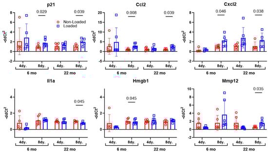 Senolytic therapy (i.e., D + Q) is not the only senotherapeutic tool available to inhibit the effects of senescent cells on neighboring healthy cells. Inhibition of the SASP, e.g., senomorphics, rather than inducing apoptosis of senescent cells, e.g., senolytics, is another approach. However, normal mechanical signaling in bone involves the release of, and signaling by, a number of inflammatory cytokines (at controlled levels and distribution), many of which overlap with the SASP. Blanket inhibition of these signals from senescent but also healthy cells—as would occur with a senomorphic—might weaken mechanotransduction responses. Tibia mechanical loading experiments were conducted on adult and aged mice and the mice were sacrificed several days later to assay changes in the expression of known SASP factors. The mice underwent tibia loading for one session at equivalent strain magnitudes, as described above. RNA was immediately isolated from the tibial diaphyses and TaqMan-based real-time PCR was performed for a subset of known osteocyte SASP markers, identified in our previous work [15]. p21, Ccl2, Cxcl2, Hmgb1, Il1a, and Mmp12, were among the SASP genes that exhibited changes in expression with loading in either 4-day or 8-day post-loading samples (Figure 4). As these mice are pharmacologically and genetically naïve (i.e., they are normal, WT mice), the naturally occurring increase in several genes that are associated with the SASP (e.g., HMGB1, Il6, and Mmp13) suggest that senomorphic treatment might interfere with mechanical signaling from otherwise healthy cells in bone.
