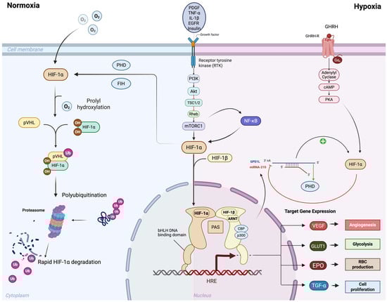 Oxygen-dependent and oxygen-independent regulation of HIF-1α signaling. Under normoxic conditions (left), HIF-1α undergoes prolyl hydroxylation by prolyl hydroxylase domain proteins (PHDs) and factor inhibiting HIF (FIH), enabling recognition by von Hippel–Lindau protein (pVHL). This leads to ubiquitination and proteasomal degradation of HIF-1α, preventing transcriptional activity. Under hypoxic conditions (right), reduced hydroxylation stabilizes HIF-1α, allowing its accumulation and dimerization with HIF-1β in the nucleus. The HIF-1α/β complex, together with transcriptional co-activators CBP and p300, binds to hypoxia response elements (HREs) to activate transcription of target genes. In addition to this oxygen-dependent regulation, HIF-1α can also be stabilized through oxygen-independent mechanisms, largely mediated by growth factor/receptor signaling pathways. These include PI3K–Akt/mTOR, NF-κB, and EGFR signaling, which enhance HIF-1α synthesis and transcriptional activity even under normoxia. Growth factors such as PDGF, TNF-α, IL-1β, and GHRH further potentiate these effects, amplifying the hypoxic response. Through both oxygen-dependent and oxygen-independent mechanisms, HIF-1α drives the expression of target genes that promote adaptive responses including angiogenesis (VEGF), glycolysis (GLUT1), erythropoiesis (EPO), and cell proliferation (TGF-α). Created in BioRender. Reme, A. (2025) https://BioRender.com/wytkie (accessed on 6 October 2025). Abbreviations: HIF, hypoxia inducible factors; PHD, prolyl hydroxylase domain; FIH, Factor Inhibiting HIF; pVHL, von Hippel–Lindau protein; HRE, hypoxia response elements, EGFR, Epidermal Growth Factor Receptor, PDGF, Platelet-Derived Growth Factor; TNF-α, Tumor Necrosis Factor-alpha; IL-1β, Interleukin-1 beta; GHRH, growth hormone-releasing hormone; VEGF, Vascular Endothelial Growth Factor; GLUT1, Glucose Transporter Type 1; EPO, erythropoietin; TGF-α, Transforming Growth Factor Alpha.