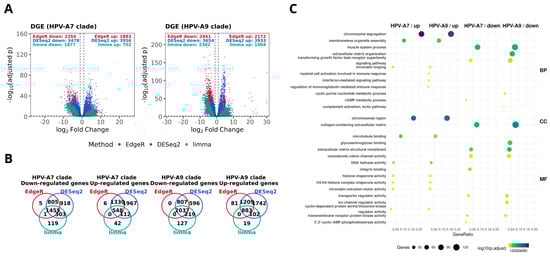Differential expression signatures in HPV-associated cervical cancer by clade. (A) Volcano plots show significantly overexpressed and underexpressed genes in tumors with presence of HPV clade A7 and HPV clade A9, computed with edgeR (red), DESeq2 (blue), and limma-voom (green). The dotted lines indicate the thresholds used to define differential expression (|log2FC| ≥ 1 and FDR ≤ 0.01). Numbers of differentially expressed genes (DEGs) are indicated for each method. (B) Venn diagrams depicting the overlap of overexpressed and underexpressed DEGs across methods within each clade. (C) Gene Ontology (GO) enrichment analysis of consensus signatures. Selected biological processes (BP), cellular components (CC), and molecular functions (MF) are displayed for over- and underexpressed genes in each clade. Dot size reflects the number of genes per category, and color represents enrichment significance (−log10 adjusted p-value).