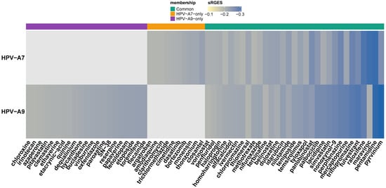 Heatmap of FDA-approved drug candidates with significant reversal potential (sRGES ≤ −0.20) across HPV clade A7 and HPV clade A9 cervical cancer signatures. Rows correspond to clades and columns to individual drugs, ordered by consensus sRGES. The color scale represents sRGES (darker blue = stronger predicted reversal). The annotation bar at the top indicates compounds common to both clades (green), unique to HPV clade A7 (orange), or unique to HPV clade A9 (purple).
