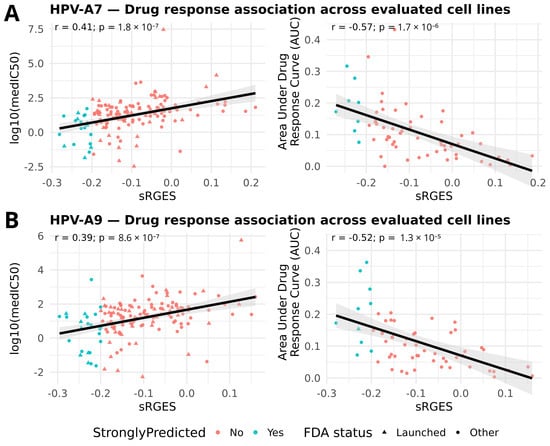 Validation of sRGES with pharmacologic response. (A) HPV clade A7; (B) HPV clade A9. Scatterplots show the relationship between sRGES (x-axis) and log10(median IC50) (left) or AUC (recomputed) (right), each point representing a candidate compound (median across tested lines). The black line shows the least-squares regression; the grey area represents its 95% confidence band.; in-panel labels display Pearson correlation (r) and nominal p-values. All tests remained significant after Bonferroni correction (A7 IC50: p_adj = 7.2 × 10−7; A7 AUC: p_adj = 6.8 × 10−6; A9 IC50: p_adj = 3.4 × 10−6; A9 AUC: p_adj = 5.2 × 10−5). Points are colored by prediction strength (sRGES ≤ −0.20) and shaped by FDA status (triangle = FDA-launched; circle = other).