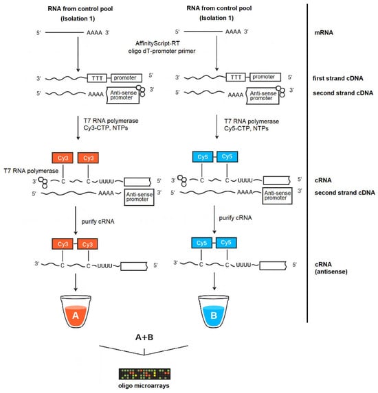 Amplified cRNA workflow for two-color oligonucleotide microarrays. Total RNA (isolation 1 control pool) was oligo(dT)-T7-primed, converted to double-stranded cDNA, and T7-transcribed to cRNA labeled with Cy3 (A) or Cy5 (B); labeled cRNA (alone or mixed A + B) was hybridized to the oligo microarray for two-color analysis (available from https://www.agilent.com/cs/library/usermanuals/public/G4140-90050_GeneExpression_TwoColor_6.9.pdf?srsltid=AfmBOoqnVSm5rjbwReMbJQ43s0-Dc4LjT_9lArxaqtHyc5o1QHFuZ_bL (accessed on 16 November 2025)).