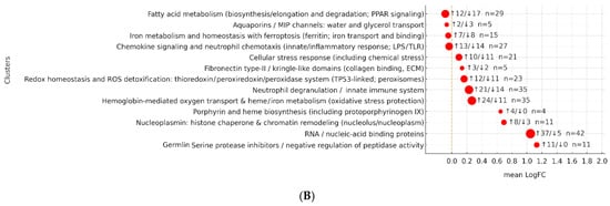 (A,B). Summary of expression changes across functional categories. (A,B) Dot plots summarize mean log2 fold-change (mean LogFC) values for genes grouped by functional terms or clusters. The x-axis represents the mean LogFC (dashed line = no directional change). Dot size is proportional to the number of genes within a given category (n), and labels indicate the counts of up and downregulated genes in the format “↑u/↓d—n”. (A) g:Profiler enrichment analysis: each blue dot represents a functional term (GO/pathway/motif). Terms are ordered by mean LogFC. (B) DAVID functional clusters: each dot corresponds to one functional cluster, sorted by mean LogFC (lowest at top). Red dots represent clusters; labels show numbers of up and downregulated genes and total gene counts.