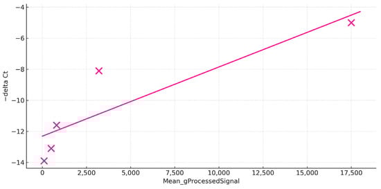In the healthy control, we assessed agreement between microarray per-channel intensity (Cy3; Mean_gProcessedSignal) and RT-qPCR readouts (−ΔCt) for five targets (SAA, CCL19, CD209, MMP9, CXCL8a). The two platforms showed a positive association (least-squares fit: slope = 0.0004368, intercept = −12.177; Pearson R= 0.896, n = 5, p= 0.04), with ranking consistency across genes, with highest abundance by both methods for SAA and lowest for CXCL8a (Figure 4).