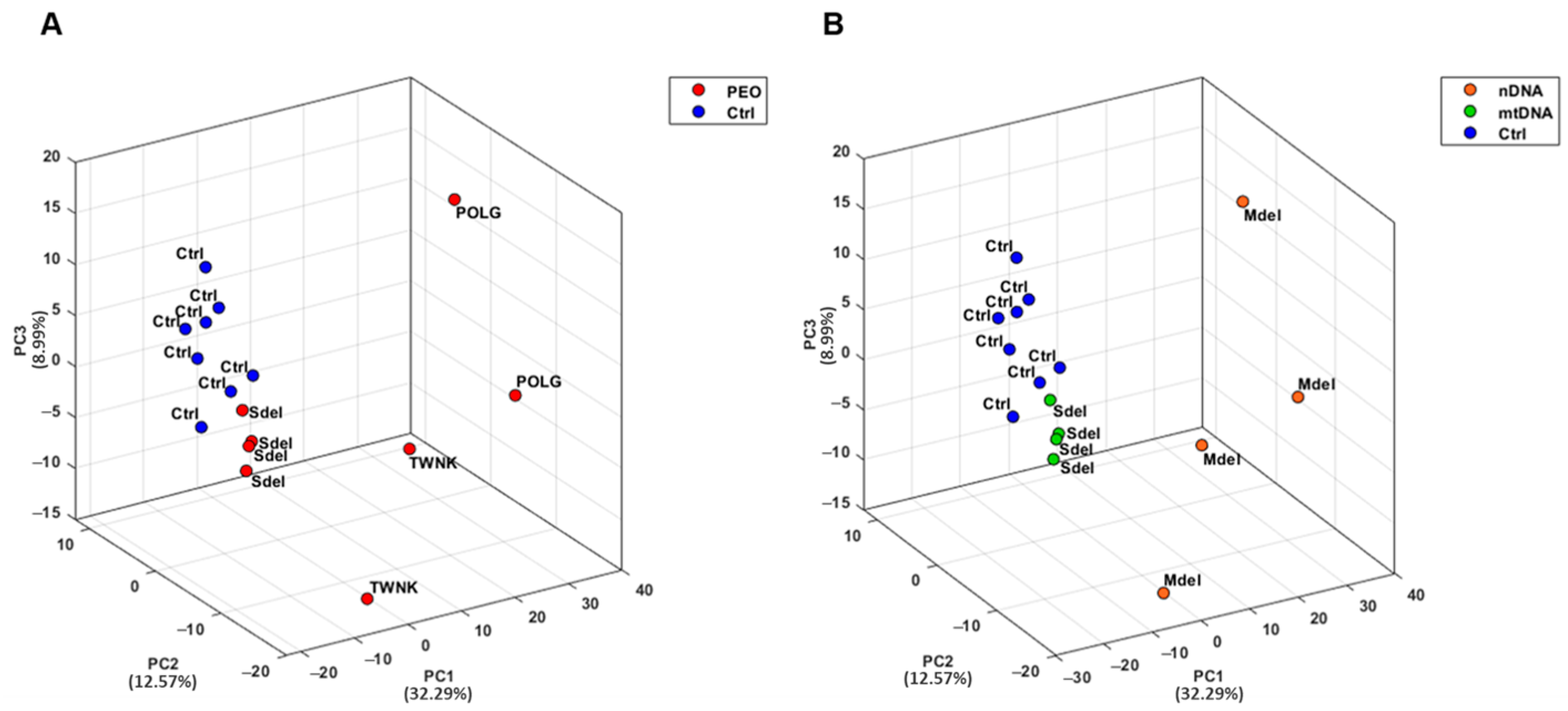 Given that PEO is a rare and clinically heterogeneous mitochondrial disorder, these results, although derived from a limited patient cohort, highlight reproducible molecular signatures that may support diagnosis, patient stratification, and longitudinal monitoring.