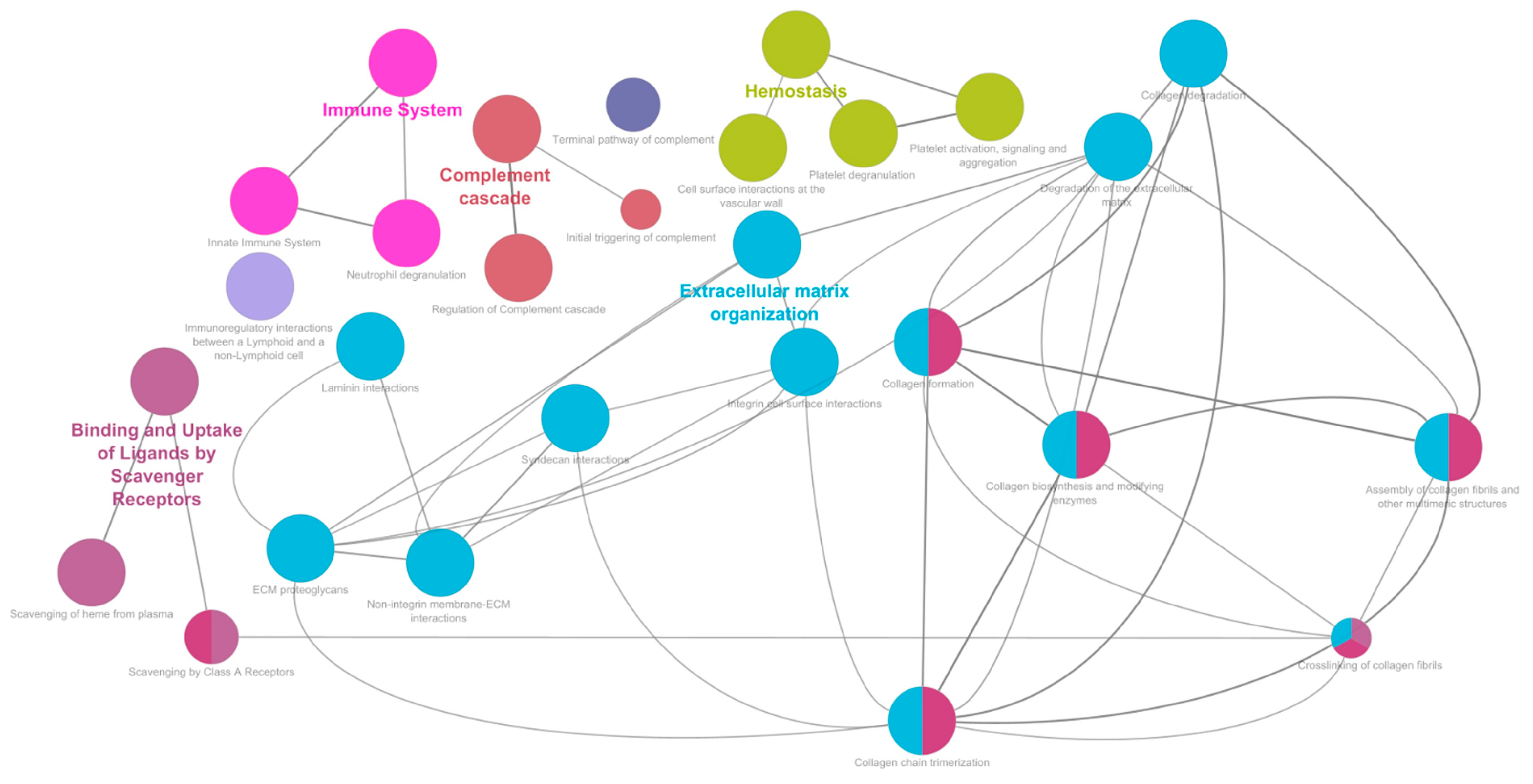 p < 0.01 (***)). A total of 406 differentially expressed proteins were identified, of which 154 with statistical significance. The pathways enrichment analysis was conducted on the dataset using Reactome Pathways as the ontology source. Only pathways with an FDR < 0.05 were considered and selected for further analysis. The pathways with the highest statistical significance hierarchically belong to four major areas relative to the “Extracellular matrix organization”, “Immune System”, “Hemostasis”, and “Binding and uptake of ligands by scavenger receptors” macro-pathways (
