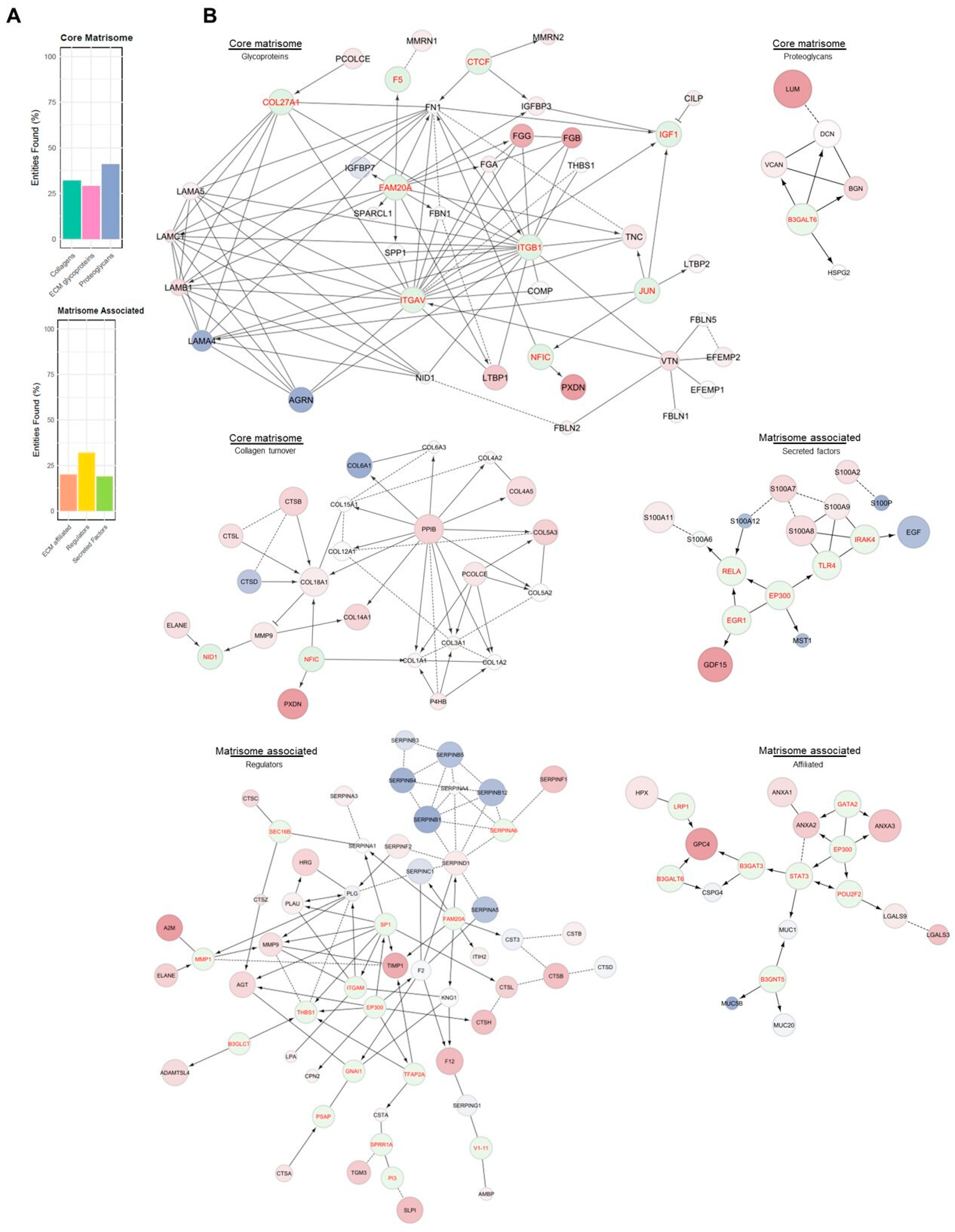 Figure 3B), suggesting both a structural impairment due to the upregulation of core matrisome components, and a functional impairment, considering the altered expression of enzymes regulating ECM mechanisms and their interactors.