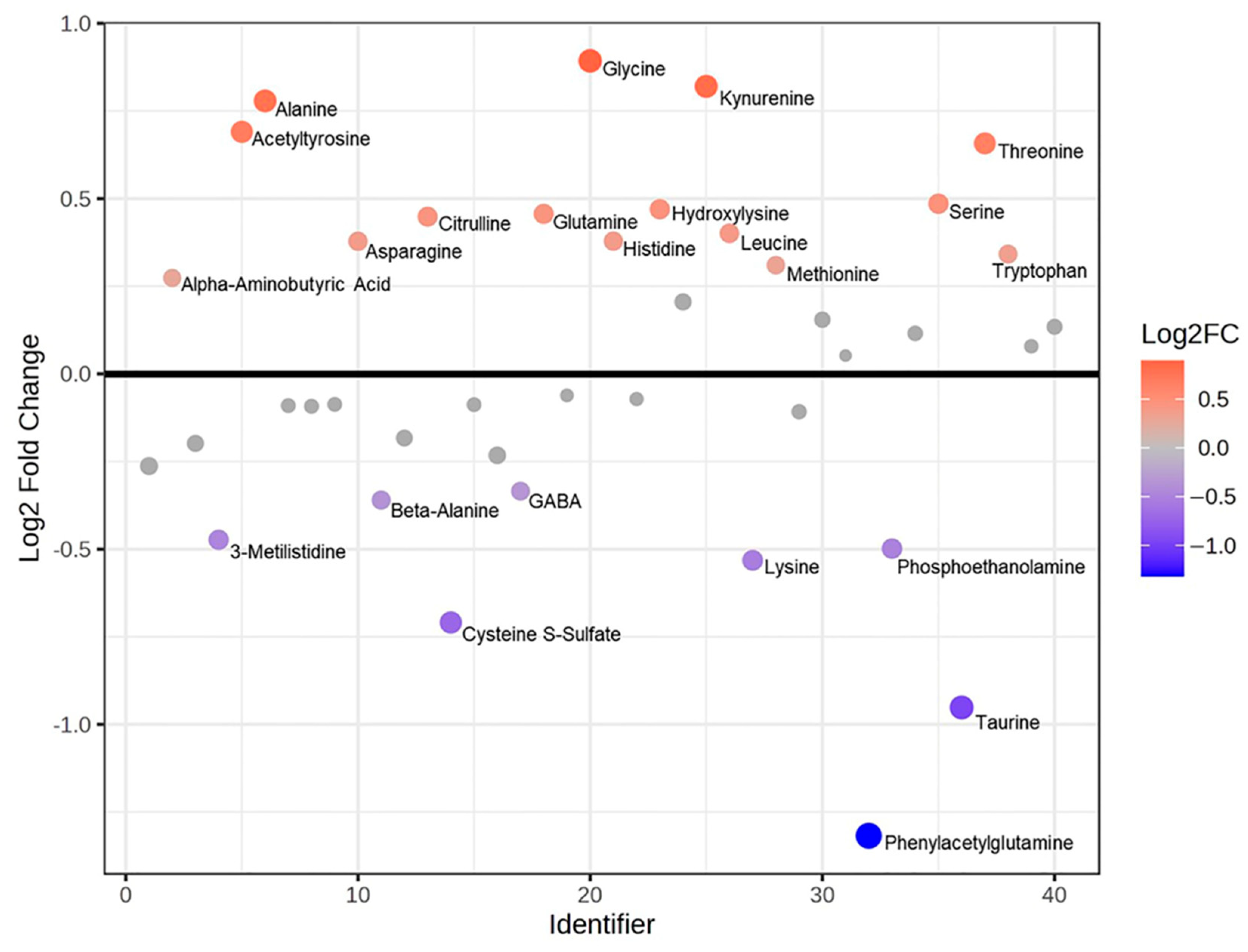 AA with >5 missing values were eliminated, while those with missing values < 5 (2.6%) were replaced with LOD, determined as 1/5 of the smallest quantified value for each variable. Then, data were treated with quantile normalization, log-transformation, and autoscaling to perform the bioinformatics analysis. Data were analyzed using Joint Pathways Analysis and differential expression analysis. For the differential expression analysis, FC threshold of 1.2 and