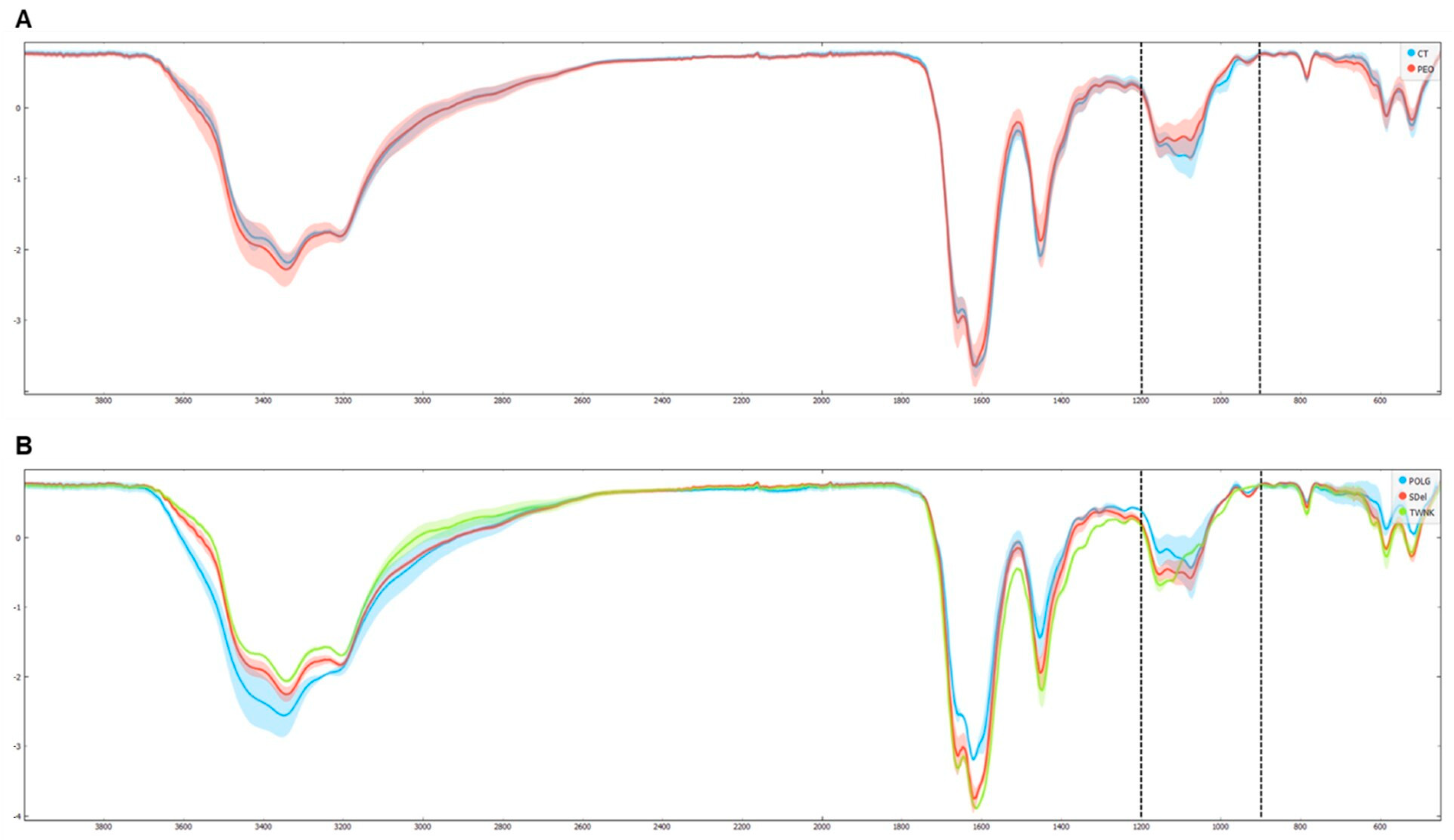 −1 wavenumber range in transmittance mode (T%). The average transmittance spectra of PEO and Ctrl (which contain the relative peaks of biomolecules such as proteins, lipids, carbohydrates and nucleic acids) were overlapped to explore the differences (