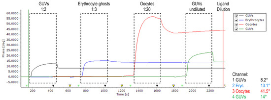 Figure 3 shows the titration of the immobilized EG with increasing concentrations of disintegrins vs. unspecific binding to GUVs on a parallel channel. As is obvious, the highest difference is observable when mobile obtustatin interacts with erythrocyte ghosts, while the phase response for echistatin is remarkably lower. The phase response depends on the number of receptors on the cellular surfaces, and the number of integrins might be too low to generate a significant signal of the relatively small echistatin.