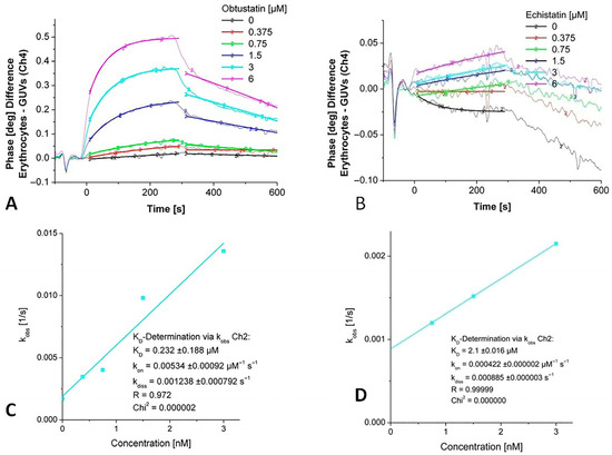 Detection of kinetic binding constants of echistatin and obtustatin binding to integrins in an immobilized membrane preparation (white erythrocyte ghosts). (A,B). Phase shift versus time diagrams for increasing concentrations of injected disintegrins echistatin and obtustatin. (C,D). A non-linear curve fitting in the area for the concentration depending on the association rate constant (kobs) vs. the area for the dissociation rate constant (koff) for obtustatin and echistatin, respectively.