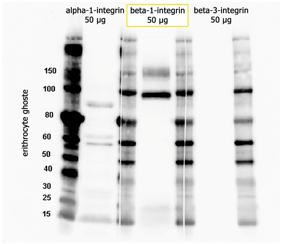 To prove the presence of the integrins α1β1 and αVβ3 in the membrane of erythrocyte ghosts, we also performed Western blot analysis. In these experiments, we used α1, β1, and β3 primary antibodies (Table 3). From Figure 4, it is clear that beta-3 integrin is absent in the samples. For α1, we expected to detect the protein at 130 kDa (the predicted band size) or higher. It was contradictory, as we had two bands in the erythrocyte ghost sample. We used HeLa cells as a positive control for α1β1 integrin (while αVβ3 is known to have low expression in HeLa cells), and in this case, we detected a protein band at 150 kDa. This means that the protein undergoes glycosylation. By comparing the data obtained from HeLa cells (see Figure S2 for data) and erythrocyte ghosts, it seems that the α1 subunit may be damaged in the processing of ghost erythrocytes; it goes through hypotonic lysis and subsequent washing/resealing steps, disrupting the underlying cytoskeleton, which typically anchors integrin subunits to the membrane. The presence of β1 integrin (with two bands) on the surface of erythrocyte ghosts is prominent (Figure 4). Partially or not-glycosylated intracellular β1 in the endoplasmic reticulum (an 88–97-kDa precursor), as well as a completely glycosylated form at the cell surface (130 kDa), unlike other integrin subunits, exists regularly [35,36,37].