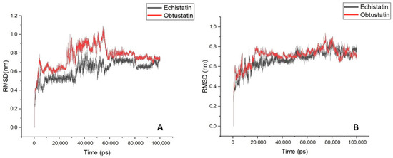 The simulation lengths of the two systems were 100 ns, and 310 K (body) temperature conditions were applied. The first 10 ns of the MD trajectory of obtustatin and echistatin was excluded from the analysis to ensure proper equilibration.