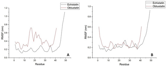 In the Figure 6B plots, the root mean square deviation (RMSD) of the backbone atoms relative to the NMR structure is shown following the addition of sodium ions to the medium. In approximately 10 nanoseconds, the RMSD levels off at an average of about 0.7 nm. This deviation is distributed evenly across all residues, indicating no significant conformational shift in any particular region, especially in the case of echistatin. The two graphs presented in Figure 7B support this observation. The most pronounced fluctuations occur in the integrin-binding loop and the terminal ends (N- and C-termini).