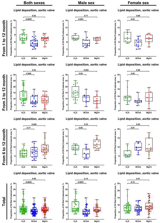 For the extensive investigation of the anti-atherogenic and anti-calcific effects of BCAA and MgCit, this study included three independent experiments with an initiation of BCAA (55 mg/day, which corresponds to a human equivalent dose of 13.5 g/day) or MgCit (1.85 mg/day, which corresponds to a human equivalent dose of 450 mg/day) supplementation in ApoE-knockout mice at 1, 3, and 6 months of age. The human equivalent doses were calculated by dividing the dose for a mouse by 12.3 (a coefficient established by the Food and Drug Administration). At 12 months of age, all animals were euthanized, with the subsequent evaluation of lipid retention in the AV and aorta through Oil Red O staining and the assessment of calcium deposition in the AV through Alizarin Red S staining. The initiation of BCAA treatment at 1 and 3 months reduced the lipid burden in the AV by ≈30% in comparison with mock-treated mice (5.38% (4.39–6.78%) vs. 7.54% (6.72–9.22%), respectively, at 1 month; 7.34% (6.03–12.19%) vs. 10.49% (8.89–16.27%), respectively, at 3 months; Figure 1 and Figure 2, Supplementary Figure S1). Yet this effect was lost if the BCAA intake started at 6 months of age (7.38% (4.60–9.76%) and 6.47% (5.12–8.12%) in BCAA- and mock-treated groups, respectively; Figure 1 and Figure 2, Supplementary Figure S1). Such effects of BCAA treatment were more pronounced in male mice (5.33% (4.42–6.78%) vs. 7.54% (7.12–8.75%) in BCAA- and mock-treated groups, respectively, at 1 month; 11.24% (7.57–12.62%) vs. 14.82% (10.89–20.22%), respectively, at 3 months; 4.66% (3.14–6.80%) vs. 7.02% (6.25–8.24%), respectively, at 6 months; Figure 1 and Figure 2, Supplementary Figure S1) than in female mice (5.81% (4.30–6.93%) vs. 7.54% (5.98–10.14%), respectively, at 1 month; 6.62% (5.75–7.11%) vs. 9.26% (6.95–10.18%), respectively, at 3 months; 9.74% (8.18–12.40%) vs. 5.65% (4.84–8.07%), respectively, at 6 months; Figure 1 and Figure 2, Supplementary Figure S1). In total, BCAA intake decreased the lipid burden in the AV by ≈20% compared with mock-treated mice (6.73% (4.81–8.47%) vs. 8.46% (6.46–11.05%), respectively), with a ≈25% reduction in male mice (6.50% (4.42–8.38%) vs. 8.84% (7.24–14.82%) in BCAA- and mock-treated groups, respectively) and only a ≈15% reduction in female mice (6.85% (5.74–8.95%) vs. 7.91% (5.88–9.89%), respectively; Figure 1 and Figure 2, Supplementary Figure S1). In contrast to BCAA, the intake of MgCit inconsistently affected lipid deposition in the AV in comparison with the mock treatment (7.94% (6.72–10.16%) vs. 8.46% (6.46–11.05%) in the pooled sample, respectively; Figure 1 and Figure 2, Supplementary Figure S1). In the pooled sample of male mice, MgCit showed an insignificant protective effect (7.84% (6.63–10.00%) vs. 8.84% (7.24–14.82%) in MgCit- and mock-treated groups, respectively) but the association was inverse in the female mice (8.70% (6.98–11.39%) vs. 7.91% (5.88–9.89%), respectively; Figure 1 and Figure 2, Supplementary Figure S1).
