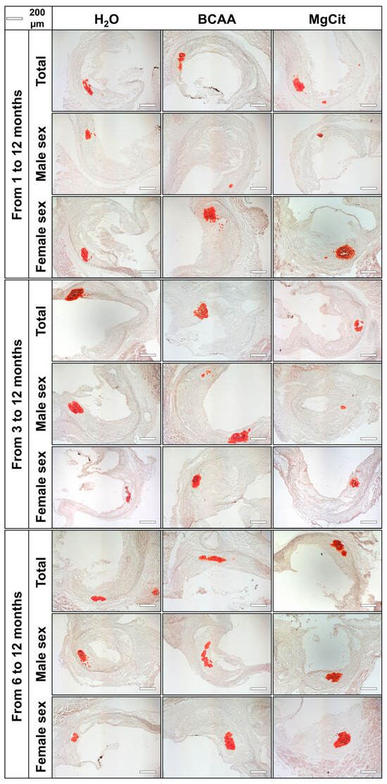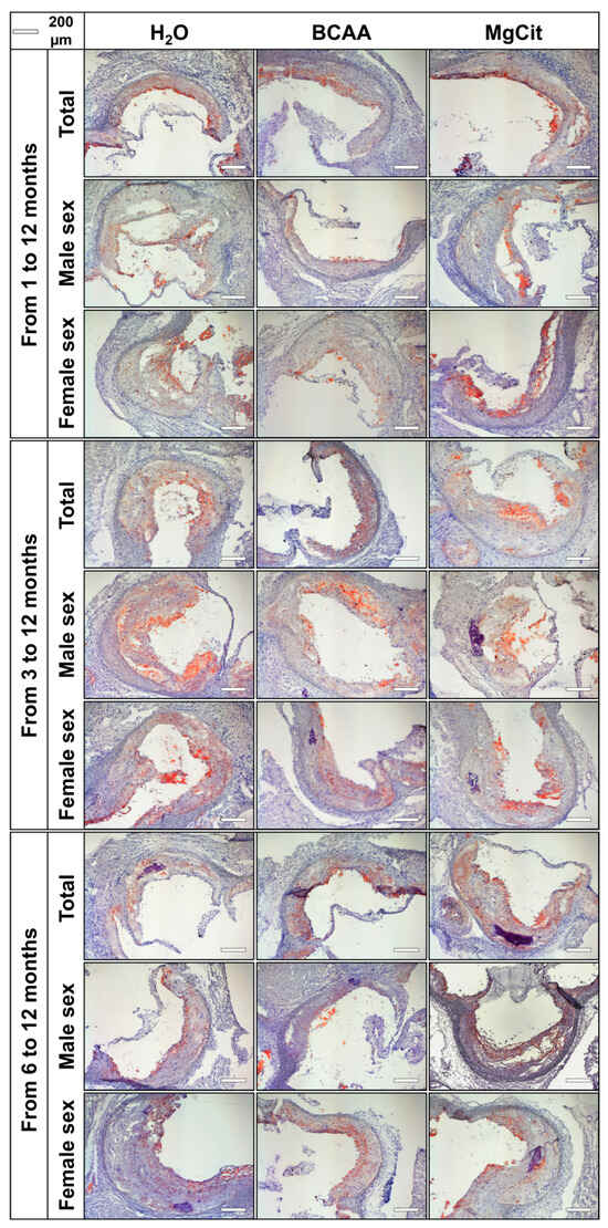 Randomized clinical trials and meta-analyses showed that BCAA supplementation has a number of beneficial effects, including the stimulation of muscle protein synthesis [67,68,69], reduction in muscle soreness [70,71,72,73], and inhibition of muscle loss [74,75,76], in particular in the elderly [67,74] and patients with liver cirrhosis suffering from hypoalbuminemia [68,69,75,76]. Several studies also reported that BCAA intake improved survival in mice [77] and humans [78], in particular patients with liver cirrhosis [22,79]. Magnesium supplementations, such as MgCit, have also shown efficiency in improving the quality of life of stressed adults [80] and of patients with a major depressive disorder [81] or type 2 diabetes mellitus [82], potentially by exerting anti-inflammatory effects [83]. Low serum albumin, whose synthesis is stimulated by BCAA supplementation [20,21,22,23,24], has been associated with venous thromboembolism [35,36], major adverse cardiovascular events [35,36,37,38], and cardiovascular death [39,84]. Along similar lines, low serum magnesium correlated with arterial hypertension [85], coronary artery disease [86,87,88], major adverse cardiovascular events [89], and cardiovascular death [55,56,57,58]. This study examined whether BCAA (55 mg/day, corresponding to a human equivalent dose of 13.5 g/day) or MgCit (1.85 mg/day, corresponding to a human equivalent dose of 450 mg/day) intake can reduce the lipid and calcium burden in the AVs and blood vessels of ApoE-knockout mice. As the current guidelines for animal studies require equal numbers of male and female mice [89,90,91,92,93,94,95], and having considered the estrogen-dependent effects of BCAA [61,62,63,66] and magnesium [64,65] supplementations, both pooled and sex-specific analyses have been performed. Furthermore, it was assessed whether the timing of the treatment initiation (1, 3, and 6 months of age, which corresponds to 16–19, 20–34, and 35–44 years of age in humans) affects its outcome at 12 months of age (corresponding to 60–74 years of age in humans).
