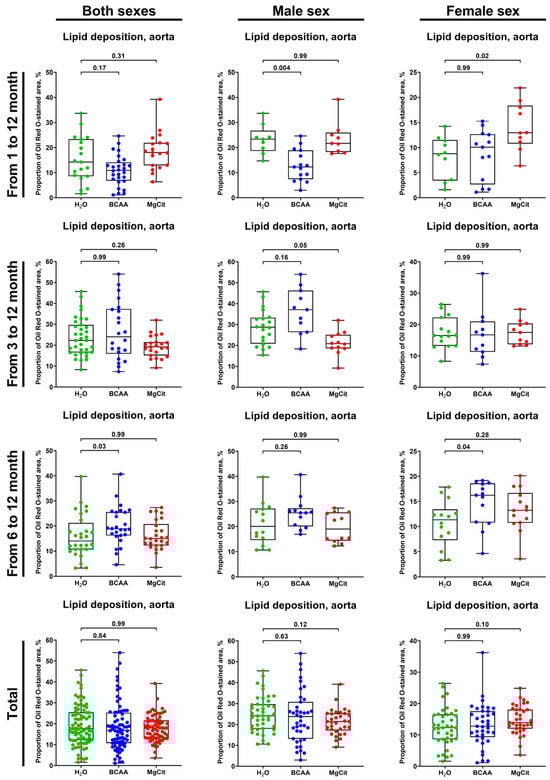 Neither the BCAA nor the MgCit intake was able to consistently reduce the lipid burden in the aorta regardless of the treatment duration (Figure 3 and Figure 4), although BCAA supplementation reduced it by ≈50% in male mice if the treatment was started at 1 month of age (12.27% (7.43–18.91%) vs. 23.36% (18.68–26.74%) in BCAA- and mock-treated groups, respectively; Figure 3 and Figure 4). However, this effect was not retained in the pooled sample (16.81% (10.78–25.25%) vs. 17.66% (12.18–25.45%) in both sexes; 23.78% (13.14–30.77%) vs. 24.14% (17.94–29.68%) in male mice; Figure 3 and Figure 4) and was not found in female mice (12.77% (9.29–17.55%) vs. 12.32% (8.60–16.51%), respectively, in BCAA- and mock-treated groups in the pooled sample; 10.07% (2.66–12.67%) vs. 8.79% (3.42–11.51%) if the treatment was initiated at 1 month of age; Figure 3 and Figure 4).