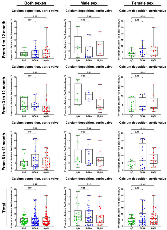 Calcium deposition in the AV also was not affected by BCAA or MgCit supplementation (4.20% (2.19–7.60%) vs. 3.82% (1.97–7.35%) vs. 3.86% (2.42–6.28%), respectively, in BCAA-, MgCit-, and mock-treated groups in the pooled sample; Figure 5 and Figure 6, Supplementary Figure S2). Again, BCAA- or MgCit-fed male mice had an insignificant reduction in the amount of calcium (3.58% (1.43–6.33%) vs. 2.98% (1.37–4.25%) vs. 3.85% (2.56–6.37%) in BCAA-, MgCit-, and mock-treated groups, respectively; Figure 5 and Figure 6, Supplementary Figure S2), whilst an inverse association was found in the pooled sample of female mice (4.46% (3.07–10.39%) vs. 6.22% (2.79–9.28%) vs. 3.86% (2.36–6.38%) in BCAA-, MgCit-, and mock-treated groups, respectively; Figure 5 and Figure 6, Supplementary Figure S2). Collectively, these results indicate the sex-specific effects of BCAA and MgCit intake, which were more efficient in reducing the valvular and vascular lipid and calcium burdens in male but not female mice.