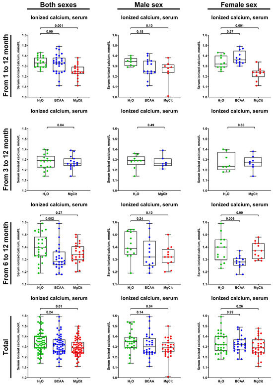 The treatment with MgCit and BCAA lowered the level of serum ionized calcium (1.29 (1.24–1.34) vs. 1.32 (1.25–1.37) vs. 1.34 (1.29–1.40) mmol/L in the pooled sample of MgCit-, BCAA-, and mock-treated mice, respectively; Figure 7). In concert with a reduced AV calcification, the indicated reduction in serum ionized calcium was more pronounced in the pooled sample of male mice (1.29 (1.25–1.34) vs. 1.30 (1.24–1.38) vs. 1.35 (1.29–1.39) mmol/L in MgCit-, BCAA-, and mock-treated mice) than in female mice, where it did not reach statistical significance (1.29 (1.24–1.37) vs. 1.32 (1.27–1.37) vs. 1.32 (1.26–1.40) mmol/L, respectively; Figure 7). Although such a decrease in the serum ionized calcium in the total sample and in male mice was statistically significant exclusively in the MgCit group, a similar trend has been observed in BCAA-treated mice (Figure 7).