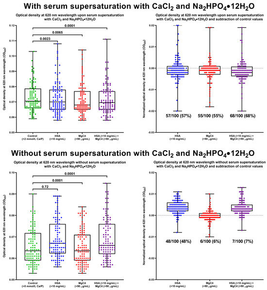 Assessment of serum calcification propensity following the addition of human serum albumin (HSA, +10 mg/mL), magnesium citrate (MgCit, +90 µg/mL), or both indicated solutions to the fresh serum of patients with ST-segment elevation myocardial infarction with (top) or without (bottom) supersaturated CaCl2 and Na2HPO4·12H2O (+2 mmol/L CaCl2 and +2 mmol/L Na2HPO4·12H2O). Serum calcification propensity was evaluated by measuring the optical density at 620 nm wavelength (OD620) in Ca/P-supersaturated and control serum after the 10 min incubation at 37 °C on a microplate shaker (left) and by subtracting OD620 values in the control serum from those in the Ca/P-supersaturated serum (i.e., normalized OD620, right). Green, blue, red, and violet dots correspond to control, HSA, MgCit, and combined HSA and MgCit treatments, respectively. Each dot on the plots represents a measurement from one patient. Whiskers indicate the range, box bounds indicate the 25th–75th percentiles, and center lines indicate the median. p values are provided above boxes; Friedman test with Dunn’s multiple comparisons test.