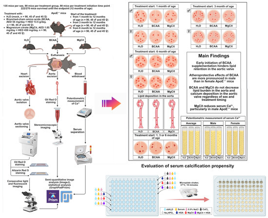 Study pipeline. The study included 270 ApoE-knockout mice: 135 mice per sex (male or female), 90 mice per treatment group (control H2O, proteinogenic branched-chain amino acids (BCAA), or magnesium citrate (MgCit)), and 90 mice per treatment initiation time point (1, 3, or 6 months of age). Of 270 mice, 222 survived until the endpoint (12 months of age). After the euthanasia, the aortic valves have been removed, sectioned, and stained with Oil Red O and Alizarin Red S to evaluate lipid and calcium deposition, respectively. Aortas were cleared of perivascular adipose tissue and tunica adventitia, stained with Oil Red O, and visualized by stereomicroscopic imaging. Semi-quantitative analysis of Oil Red O-stained and Alizarin Red S-stained images was performed using ImageJ software. Statistical analysis was conducted in GraphPad Prism. Serum has been withdrawn in order to conduct a potentiometric measurement of ionized calcium. Early BCAA intake (from 1/3 to 12 months of age) considerably reduced lipid retention in the aortic valve, whilst MgCit did not affect lipid deposition but decreased ionized calcium. Neither BCAA nor MgCit decreased lipid burden in the aorta or calcium deposition in the aortic valve. All indicated effects were more pronounced in male than in female mice. Furthermore, it was assessed whether human serum albumin (HSA) or MgCit could reduce serum calcification propensity in patients with ST-segment elevation myocardial infarction. Upon the mineral stress induced ex vivo (+2 mmol/L CaCl2 and +2 mmol/L Na2HPO4·12H2O) and 10 min incubation on the microplate shaker at 37 °C, HSA, MgCit, and particularly their combination decreased normalized OD620 (the difference in the OD620 between the supersaturated and the control serum samples).