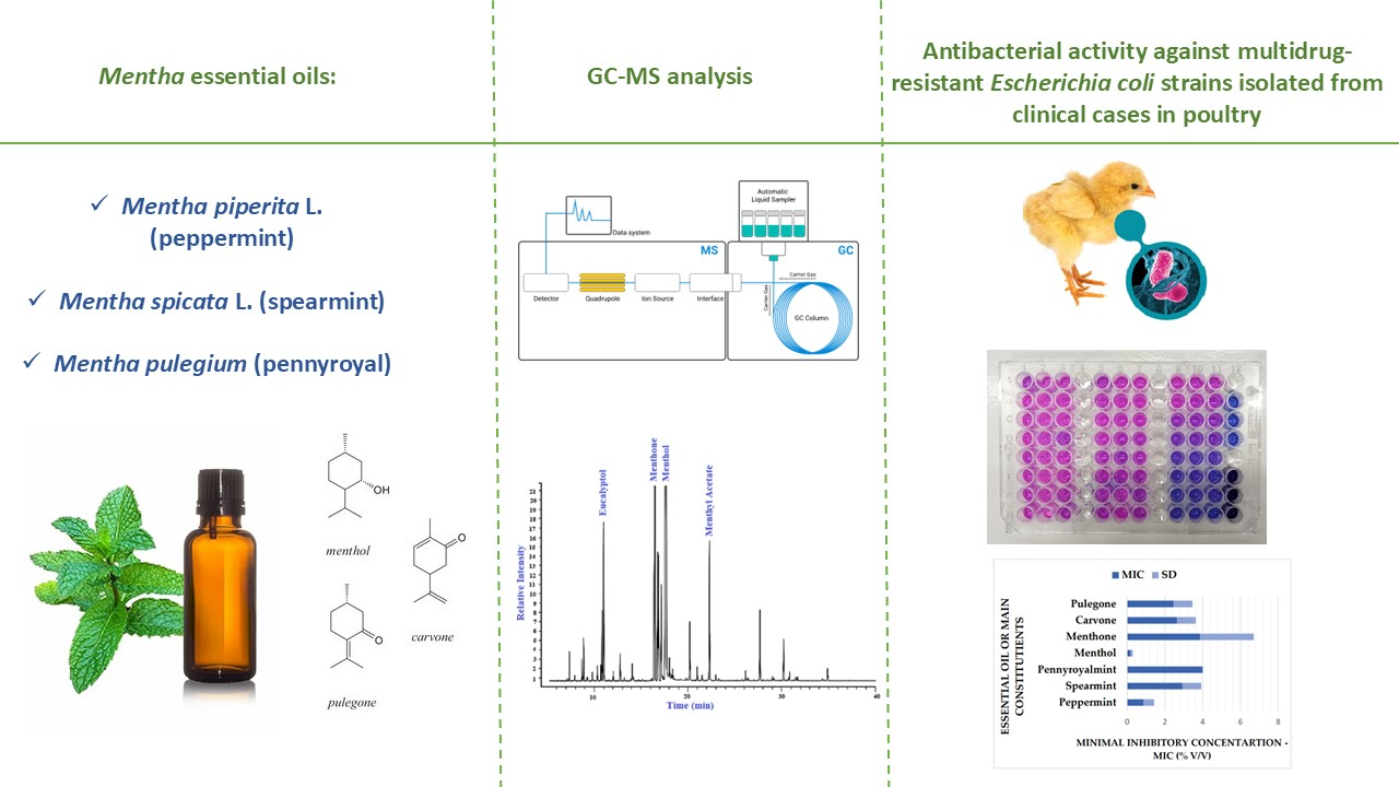 The aim of the study was to evaluate the efficacy of EOs from three Mentha species with different chemotypes, as well as their main chemical components (menthol, menthone, carvone, and pulegone), in controlling colibacillosis in poultry, using the reference E. coli strain ATCC 25922 (human strain, antibiotic-sensitive) and clinical strains with varying antibiotic susceptibility.