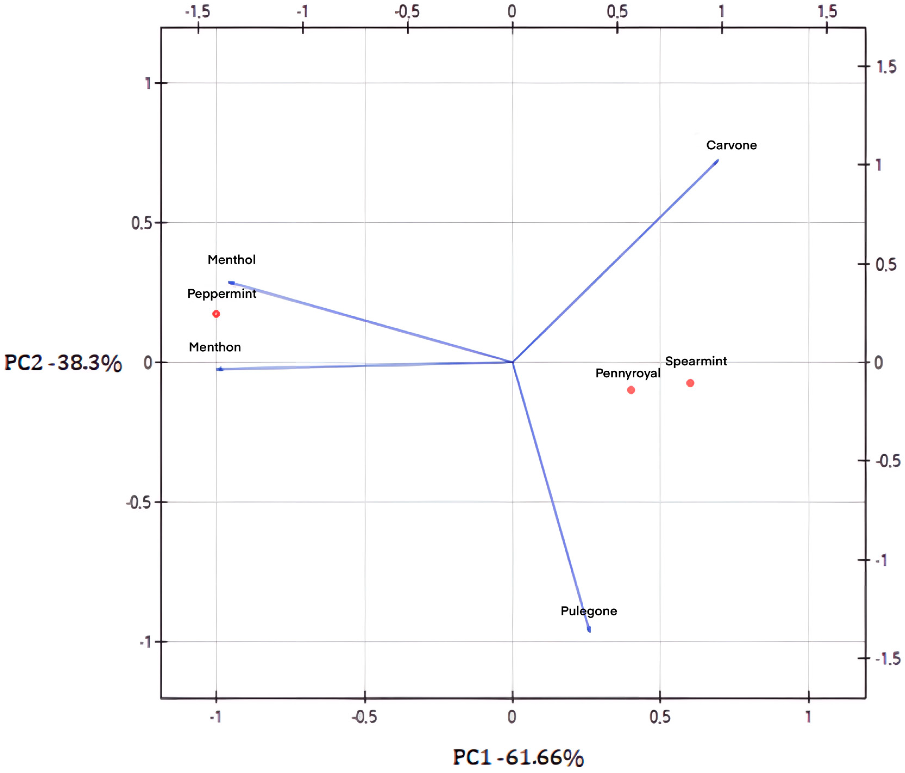 GC-MS analysis provided comprehensive information on the primary composition of Mentha EOs, allowing the identification and confirmation of the specific chemotype for each mint species. Analysis of the antibacterial activity results for the individual EOs and their main components, in relation to the composition of the tested oils from various mint varieties, indicates that chemotypes with the highest possible menthol content should have the greatest antibacterial potential against pathogenic E. coli strains. PCA (Figure 2) indicated differences between the major components of EOs from the Mentha species under study. Considering the projection of parameters onto the plane based on the first two components, the first component (explaining 61.66% of the variance) characterizes the menthol chemotype of mint, while the second component (38.34% of the variance) reflects the contribution of other active compounds.