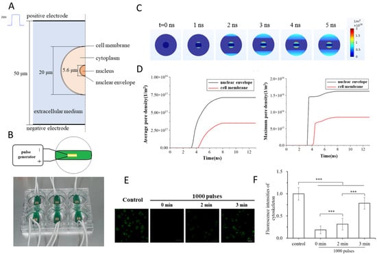 nsPEF-induced electroporation of nuclear and plasma membranes. (A) Model of a single cell with a nucleus positioned between electrodes. (B) Experimental setup with a custom nsPEF generator and culture chamber. (C) Simulation of electric field distribution at 0–5 ns, showing preferential charging of the nuclear envelope. (D) Quantification of pore density over time, with nuclear envelope poration exceeding that of the plasma membrane. (E) Experimental imaging of propidium iodide uptake after 1000 pulses at different time points. (F) Quantitative fluorescence analysis confirming progressive nuclear permeability. Adapted from []. (Differences between groups are denoted by *** p < 0.001).