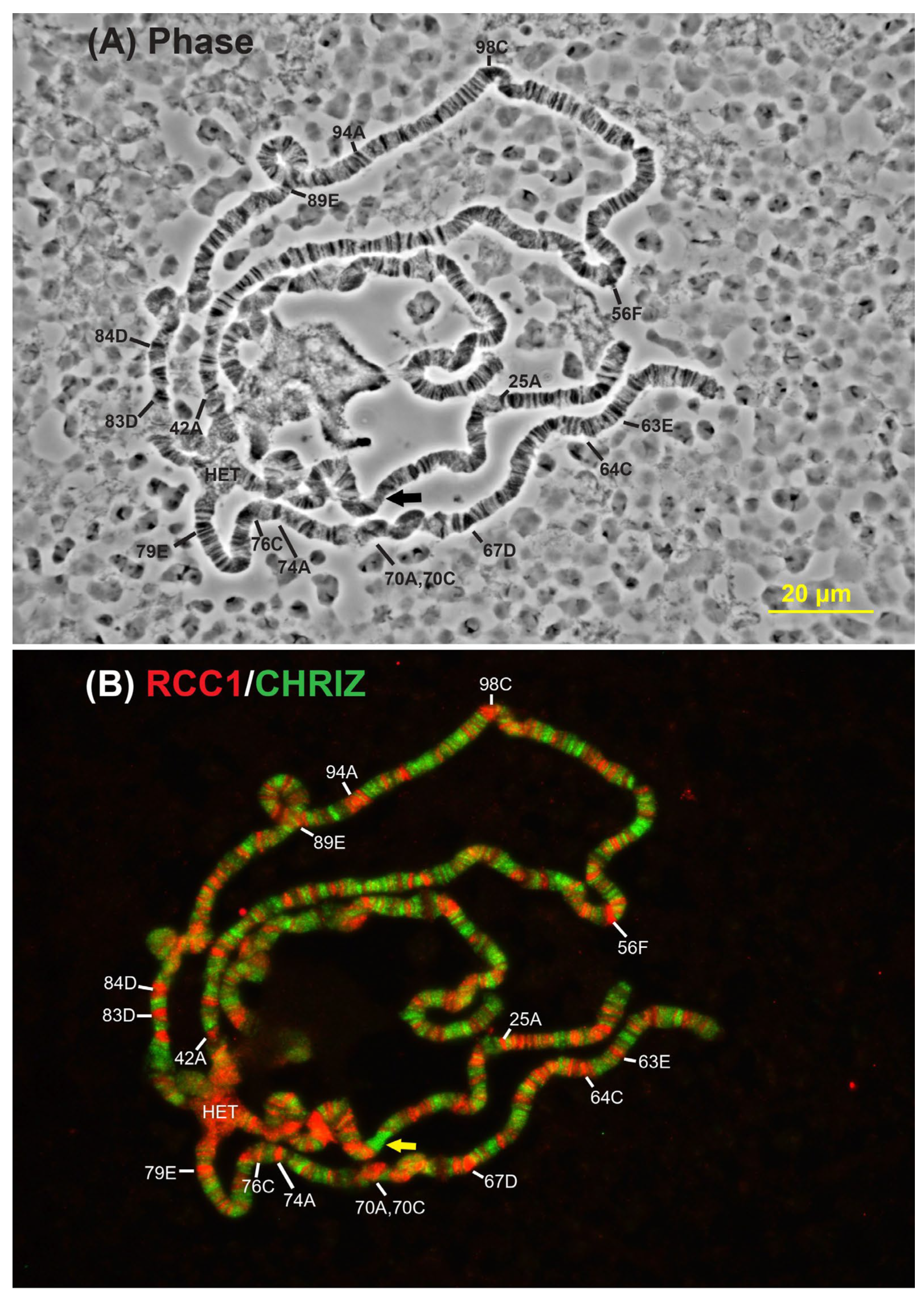 - Zykova, T.Y.; Maltseva, M.V.; Demakov, S.A.; Pokholkova, G.V.; Veryaskina, Y.A.; Lavrik, O.I.; Kolesnikova, T.D.; Zhimulev, I.F. Conservative Protein RCC1 Is a New Component of Black Bands of Drosophila melanogaster Polytene Chromosomes. Ontogenez 2023, 54, 176–180. [Google Scholar] [CrossRef]