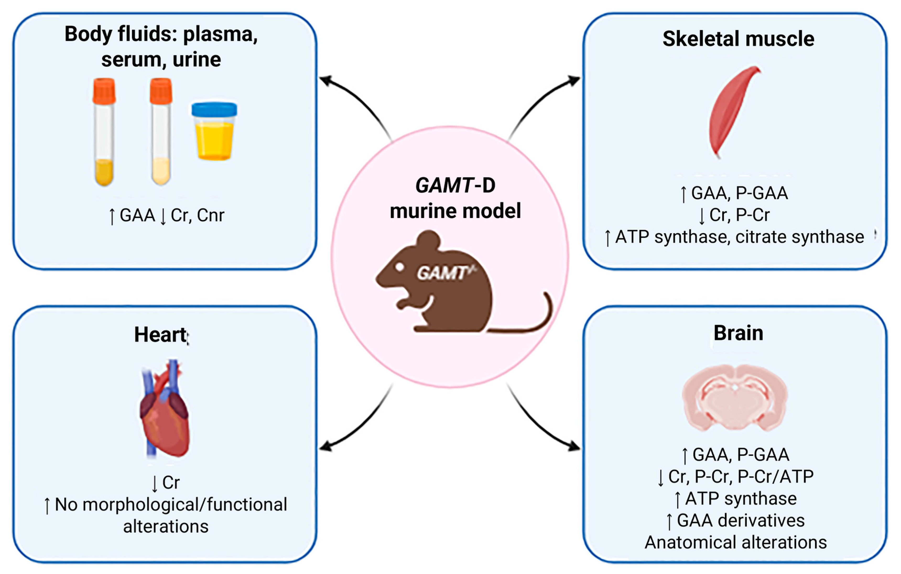 Biagiotti S, Perla E, Guzzo SM, Tolve M, Nardecchia F, Rossi L, Carducci C, Pascucci T, Leuzzi V, Magnani M. GAMT Deficiency: Clinical Presentation, Treatment, Diagnosis, Animal Models, Preclinical and Clinical Developments. International Journal of Molecular Sciences. 2025; 26(23):11282. https://doi.org/10.3390/ijms262311282
