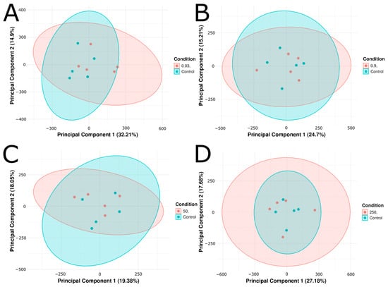 Principal component analysis (PCA) plots of (A) Control vs. 0.03 μg/L citalopram, (B) Control vs. 0.9 μg/L, (C) Control vs. 50 μg/L, and (D) Control vs. 250 μg/L citalopram. Each plot shows the first two principal components derived from transcript per-million (TPM) normalized gene expression values. Five biological replicates (n = 5) per condition are shown as individual points, and ellipses correspond to 95% confidence intervals. The percentage of variance explained by each principal component is displayed on the x and y axis.