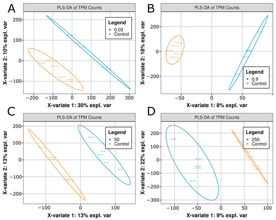 In contrast, partial least squares-discriminant analysis (PLS-DA), a supervised technique that is particularly useful for identifying biomarkers and distinguishing between physiological states, demonstrated clear separation in two variates (Figure 2A–D). The respective X axis variates (X-variate 1) and Y-axis variates (X-variate 2) explained variance values were 30%/10%, 8%/18%, 13%/13%, and 9%/22% for the 0.03, 0.9, 50, and 250 μg/L conditions, respectively (Figure 2A–D). Thus, while PCA was insufficient to discriminate treatments from control, PLS-DA identified separable variance, with each treatment condition showing a combined explained variance above 25%. These data indicated that while the majority of transcript levels were similar between control vs. treatment groups (Figure 2A–D), there was enough unique variance between each group that they could be separated by PLS-DA techniques (Figure 2A–D).