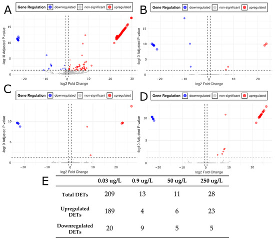 Volcano plots for (A) Control vs. 0.03 μg/L citalopram, (B) Control vs. 0.9 μg/L, (C) Control vs. 50 μg/L, and (D) Control vs. 250 μg/L citalopram. X axis threshold dotted lines occur at ±0.6 log2FC. This requires an expression change of ±1.5 compared to control. The Y axis threshold dotted line occurs at padj = 0.05. Red colorations are differentially expressed transcripts (DETs) with a positive log2FC and significant padj (≤0.05). Blue coloration is indicative of differentially express transcripts with a negative log2FC and significant padj (≤0.05). (E) DETs relative to controls reported for each concentration of citalopram tested (0.03, 0.9, 50, and 250 μg/L) for total, upregulated, and downregulated subcategories.