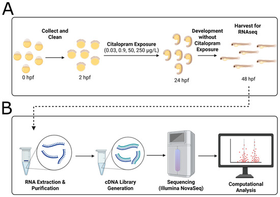 Citalopram hydrobromide exposure protocol and RNA sequencing protocol. (A) Exposure protocol. Zebrafish embryos were collected and cleaned immediately after fertilization. Exposure to citalopram (0.03, 0.9, 50, or 250 μg/L, corresponding to wastewater effluent, surface water, therapeutic blood serum, and super-therapeutic concentrations, respectively [161,162]) began at 2 h post-fertilization (hpf) and continued until 24 hpf. After exposure time, embryos were washed and allowed to develop in clean 0.03× Danieau solution until 48 hpf at which point pooled embryos (50 per replicate; n = 5 per condition) were collected for (B) RNA extraction and sequencing. cDNA libraries were prepared and sequenced on Illumina NovaSeq X platform, and subsequent bioinformatic analyses were conducted internally.