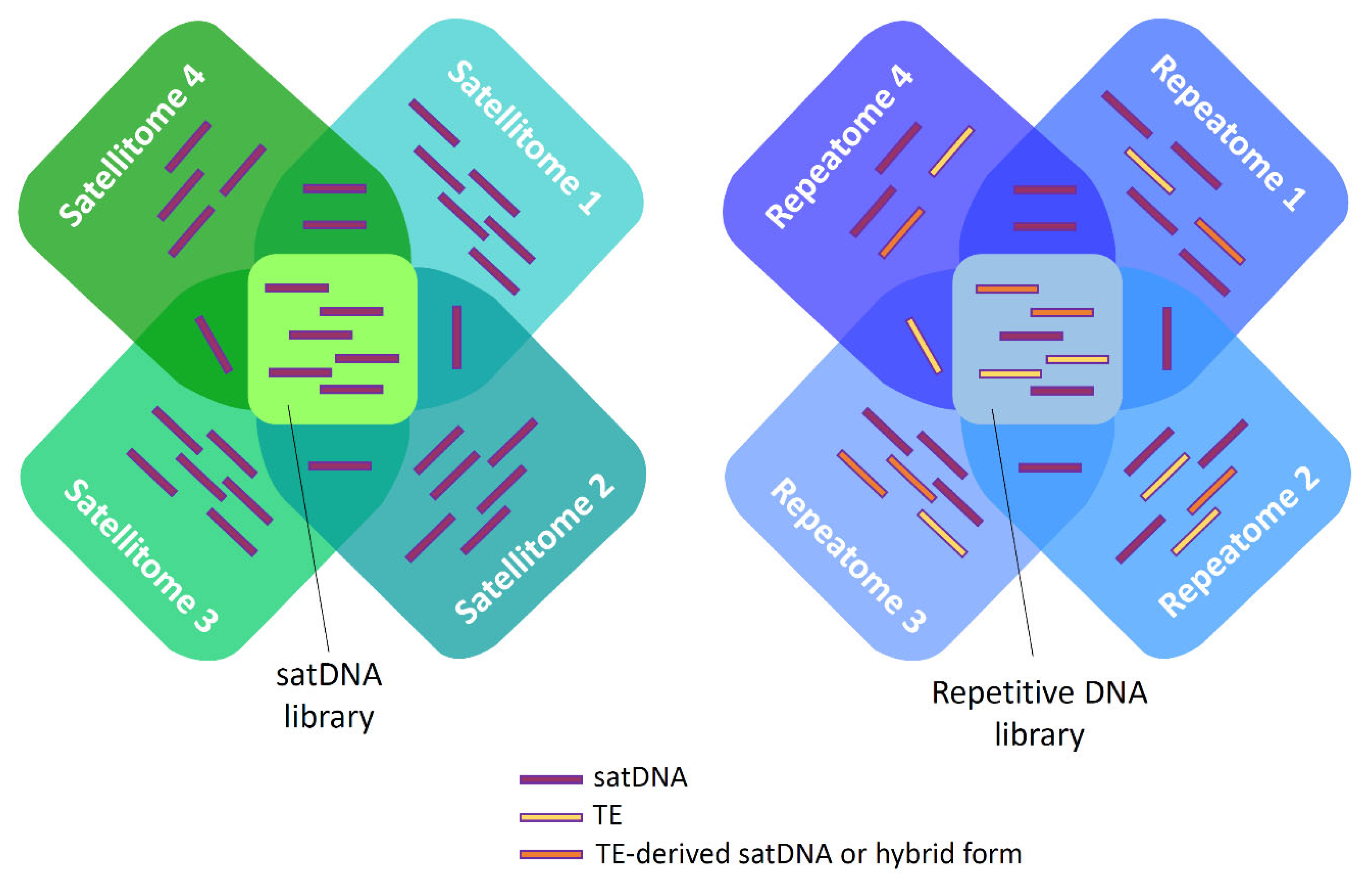 - Tunjić-Cvitanić, M.; García-Souto, D.; Pasantes, J.J.; Šatović-Vukšić, E. Dominance of Transposable Element-Related satDNAs Results in Great Complexity of “satDNA Library” and Invokes the Extension towards “Repetitive DNA Library”. Mar. Life Sci. Technol. 2024, 6, 236–251. [Google Scholar] [CrossRef]