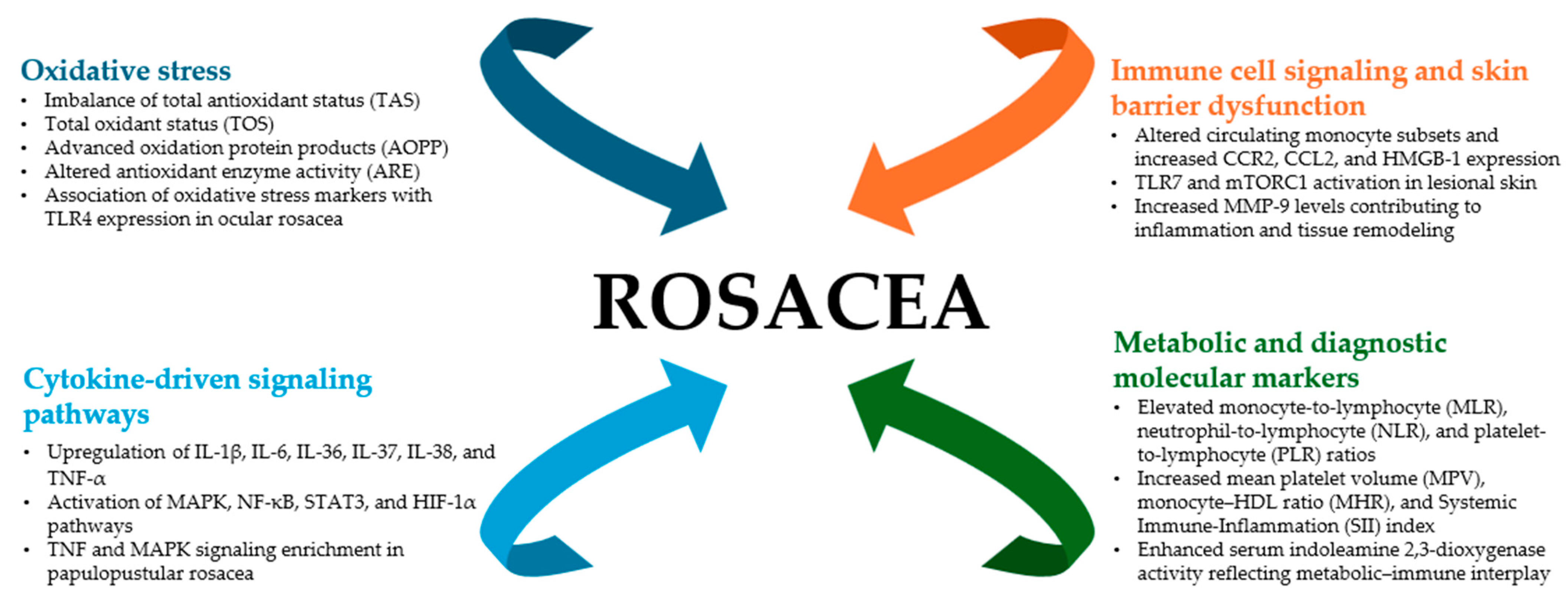 - Geng, R.S.Q.; Bourkas, A.N.; Sibbald, R.G.; Sibbald, C. Biomarkers in rosacea: A systematic review. J. Eur. Acad. Dermatol. Venereol. 2024, 38, 1048–1057. [Google Scholar] [CrossRef]