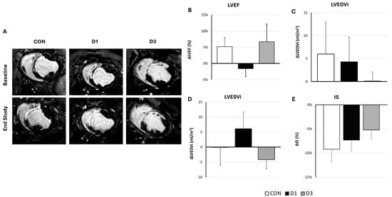 As shown in Figure 1, a trend towards better outcomes in D3 over time, with improved treatment effects, was evidenced in all cardiac function parameters measured (∆LVEF was 5.2 (2.8) % vs. −1.6 (2.5) % vs. 6.7 (5.5) %, ∆LVESVi was −0.1 (5.9) mL/m2 vs. 6.1 (5.6) mL/m2 vs. −4.2 (3.0) mL/m2, and ∆LVEDVi was 6.0 (6.9) mL/m2 vs. 4.3 (5.3) mL/m2 vs. 0.1 (2.0) mL/m2 in CON, D1, and D3 groups, respectively).