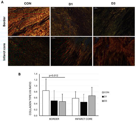Pathological examinations showed transmural fibrous scars of similar sizes and maturation as reflected in the hematoxylin eosin (HE) and Masson’s trichrome (MT) staining, in the absence of evident pathological differences (Supplementary Figure S1). The study of collagen types present at the infarct and border zone revealed a higher type I/III collagen ratio at the border zone in the control group compared to both D1 and D3 (p = 0.012), indicating increased stiffness in this group (Figure 2).