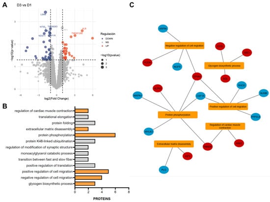 Functional enrichment analysis revealed 13 significantly enriched biological processes (BPs) (Figure 3B), 6 of which are directly implicated in MI, ranked by statistical significance (p-value). The glycogen biosynthetic process (GO:0005978) was represented by GYS1, AGL, and GBE1, all showing increased abundance after three doses, suggesting enhanced glycogen storage and improved energy availability in cardiac tissue. Regulation of cell migration was represented in both negative (GO:0030336) and positive (GO:0030335) processes. The negative regulation group included EPHA4, PODN, NGFR, and ARPIN, displaying a balanced pattern of up- and downregulation. The positive regulation group comprised EPHA4, NUMB, CSF1R, PPP3CA, and RHOD, with all proteins downregulated except for EPHA4. Protein phosphorylation (GO:0006468), a key mechanism in cardiac signaling, showed upregulation of EPHA4, ALPK3, and TNNI3K and downregulation of CSF1R, MYLK3, and MAPK4. Extracellular matrix disassembly (GO:0022617) involved an increase in KIF9 and a decrease in PLG. Finally, regulation of cardiac muscle contraction (GO:0055117) included ANK2 and TNNI3K, both upregulated (Figure 3C).