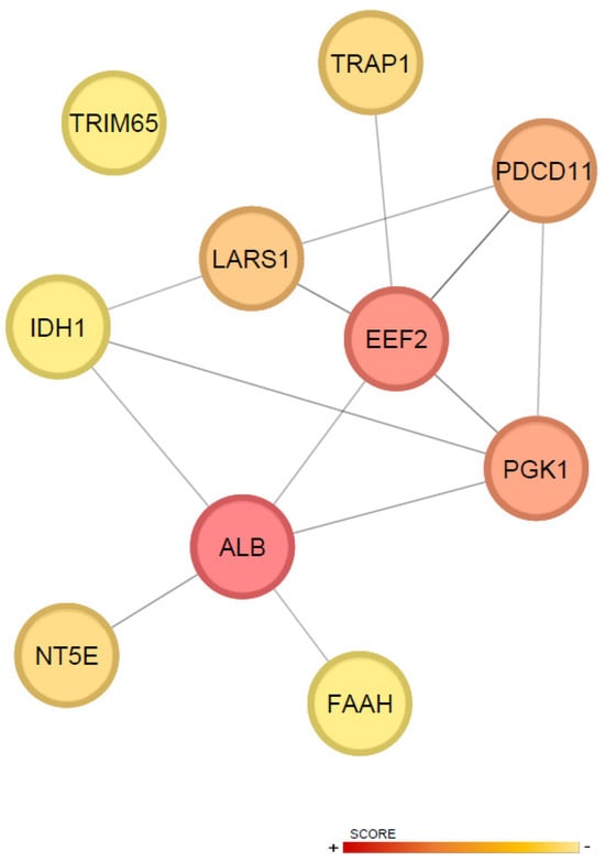 Moreover, topological analysis of the DAPs within the protein–protein interaction (PPI) network, using CytoHubba, identified the top ten hub proteins ranked by centrality score: ALB, EEF2, PGK1, PDCD11, LARS1, TRAP1, NT5E, FAAH, TRIM65, and IDH1 (Figure 4). These hubs likely play key regulatory roles in the molecular effect of the treatments.