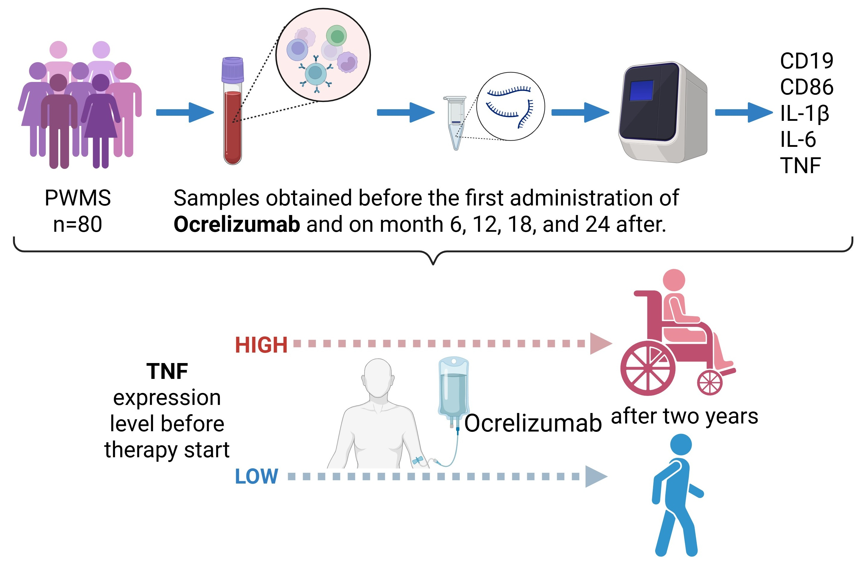 Jevtić, B.; Momcilovic, N.; Stegnjaić, G.; Lazarević, M.; Stanisavljević, S.; Tamas, O.; Veselinovic, N.; Budimkic, M.; Mesaros, S.; Miljković, Đ.; et al. Assessing Peripheral Blood Biomarkers and Predictive Patterns in Multiple Sclerosis Using Cytokines and Immune Gene Expression Profiles in Ocrelizumab-Treated Patients: Tracking Tumor Necrosis Factor. Int. J. Mol. Sci. 2025, 26, 11295. https://doi.org/10.3390/ijms262311295